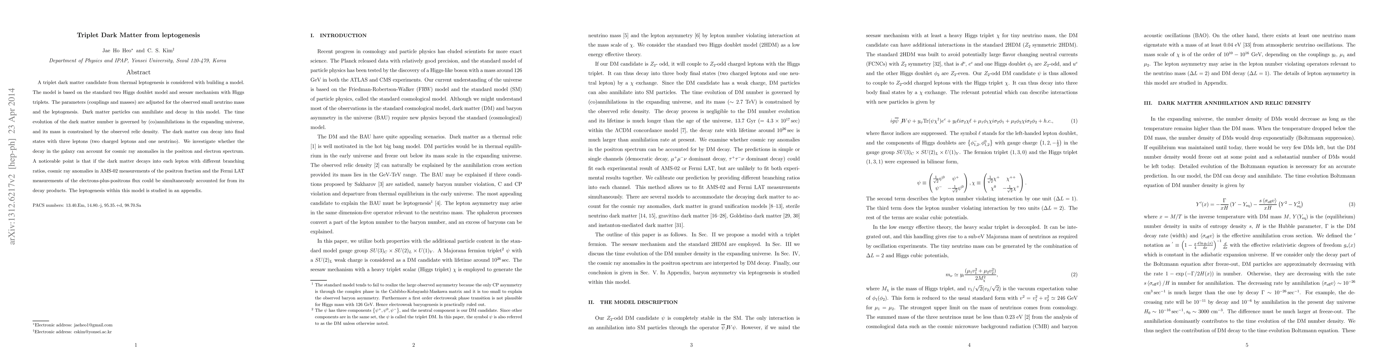 This paper proposes a triplet dark matter candidate within a model based on the standard two Higgs doublet model and the seesaw mechanism, aiming to explain both thermal leptogenesis and observed relic density. The model's dark matter can decay into three leptons, potentially explaining cosmic ray anomalies observed in positron and electron spectra.