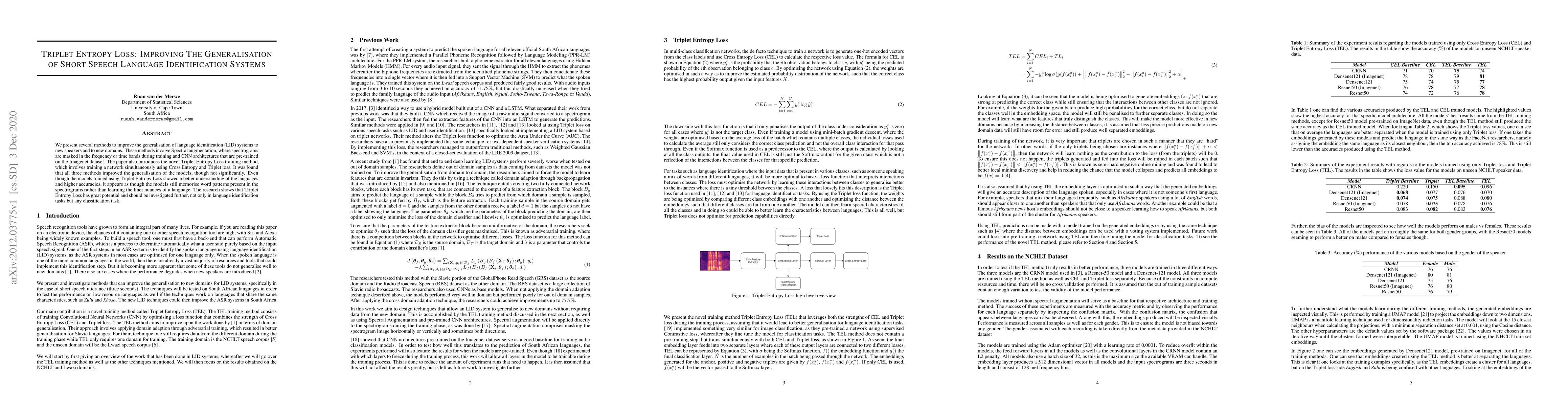 We present several methods to improve the generalisation of language identification (LID) systems to new speakers and to new domains. These methods involve Spectral augmentation, where spectrograms are masked in the frequency or time bands during training and CNN architectures that are pre-trained on the Imagenet dataset. The paper also introduces the novel Triplet Entropy Loss training method, which involves training a network simultaneously using Cross Entropy and Triplet loss. It was found that all three methods improved the generalisation of the models, though not significantly. Even though the models trained using Triplet Entropy Loss showed a better understanding of the languages and higher accuracies, it appears as though the models still memorise word patterns present in the spectrograms rather than learning the finer nuances of a language. The research shows that Triplet Entropy Loss has great potential and should be investigated further, not only in language identification tasks but any classification task.