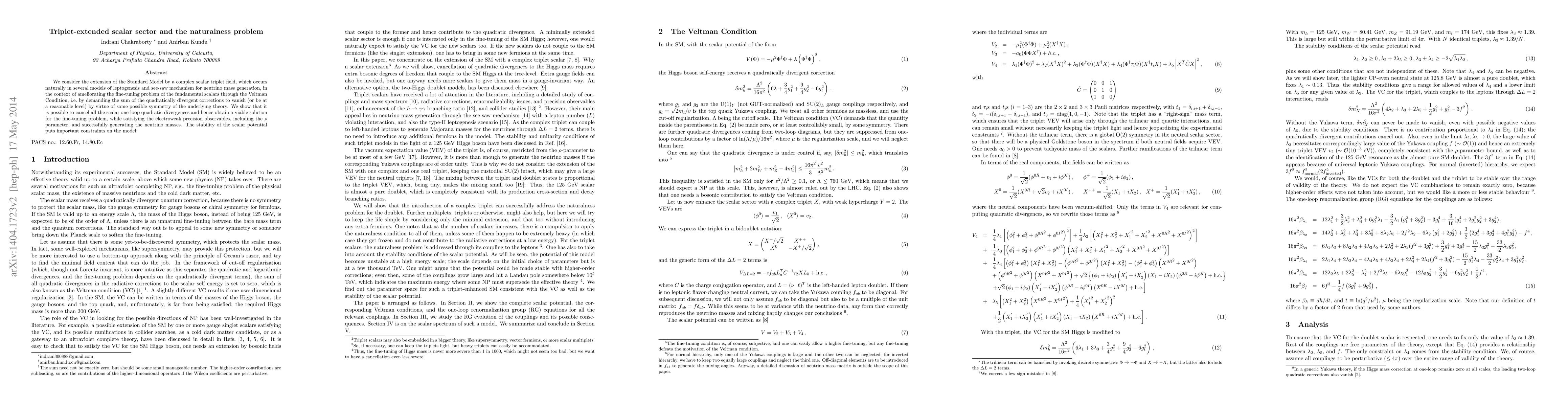 We consider the extension of the Standard Model by a complex scalar triplet field, which occurs naturally in several models of leptogenesis and see-saw mechanism for neutrino mass generation, in the context of ameliorating the fine-tuning problem of the fundamental scalars through the Veltman Condition, i.e. by demanding the sum of the quadratically divergent corrections to vanish (or be at a reasonable level) by virtue of some possible symmetry of the underlying theory. We show that it is possible to cancel all the scalar one-loop quadratic divergences and hence obtain a viable solution for the fine-tuning problem, while satisfying the electroweak precision observables, including the $\rho$ parameter, and successfully generating the neutrino masses. The stability of the scalar potential puts important constraints on the model.