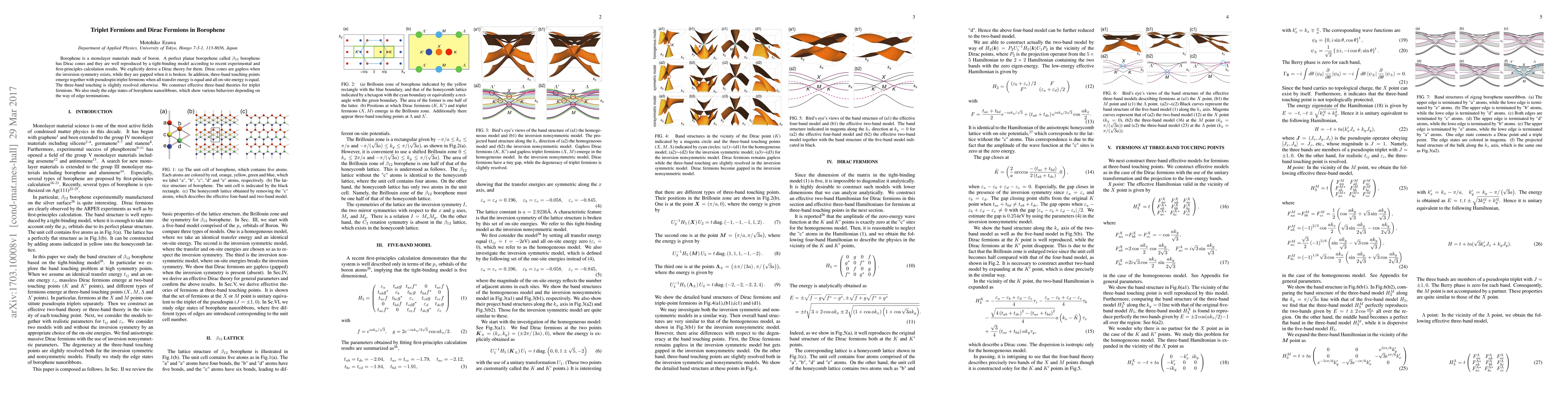 Borophene is a monolayer materials made of boron. A perfect planar boropehene called $\beta_{12}$ borophene has Dirac cones and they are well reproduced by a tight-binding model according to recent experimental and first-principles calculation results. We explicitly derive a Dirac theory for them. Dirac cones are gapless when the inversion symmetry exists, while they are gapped when it is broken. In addition, three-band touching points emerge together with pseudospin triplet fermions when all transfer energy is equal and all on-site energy is equal. The three-band touching is slightly resolved otherwise. We construct effective three-band theories for triplet fermions. We also study the edge states of borophene nanoribbons, which show various behaviors depending on the way of edge terminations.