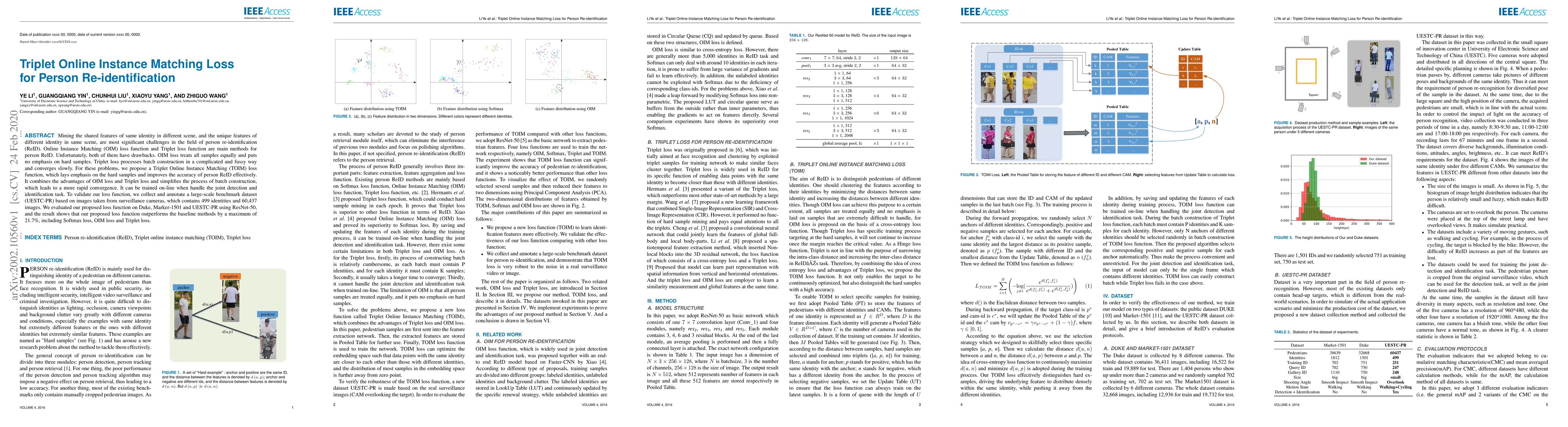 The paper proposes a Triplet Online Instance Matching (TOIM) loss function for person re-identification, emphasizing hard samples and simplifying batch construction for faster convergence. The TOIM loss outperforms baseline methods by up to 21.7% on Duke, Marker-1501, and a newly annotated UESTC-PR dataset.