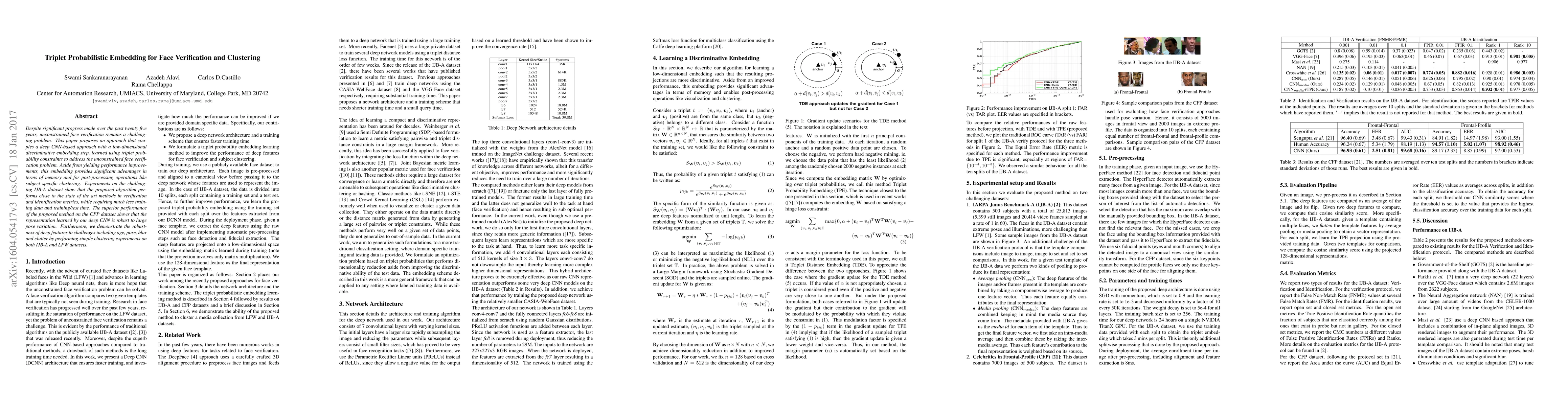 The paper proposes a deep CNN-based approach coupled with a low-dimensional discriminative embedding learned via triplet probability constraints in a large-margin fashion for face verification and clustering. The method uses triplet probability embedding (TPE) to learn a compact deep model with moderate training data, achieving competitive performance on IJB-A and CFP datasets.