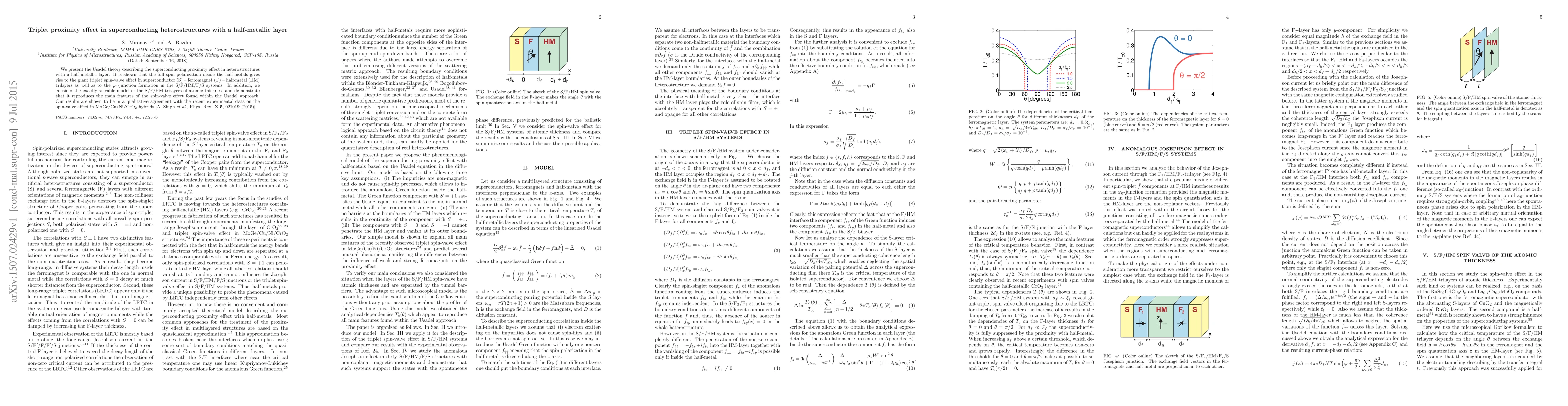 This paper uses Usadel theory to describe the superconducting proximity effect in heterostructures with a half-metallic layer, revealing a giant triplet spin-valve effect in S-F-HM trilayers and $\varphi_0$-junction formation in S/F/HM/F/S systems. The study confirms these findings with an atomic-thickness model and aligns with recent experimental data on spin-valve effects in MoGe/Cu/Ni/CrO₂ hybrids.