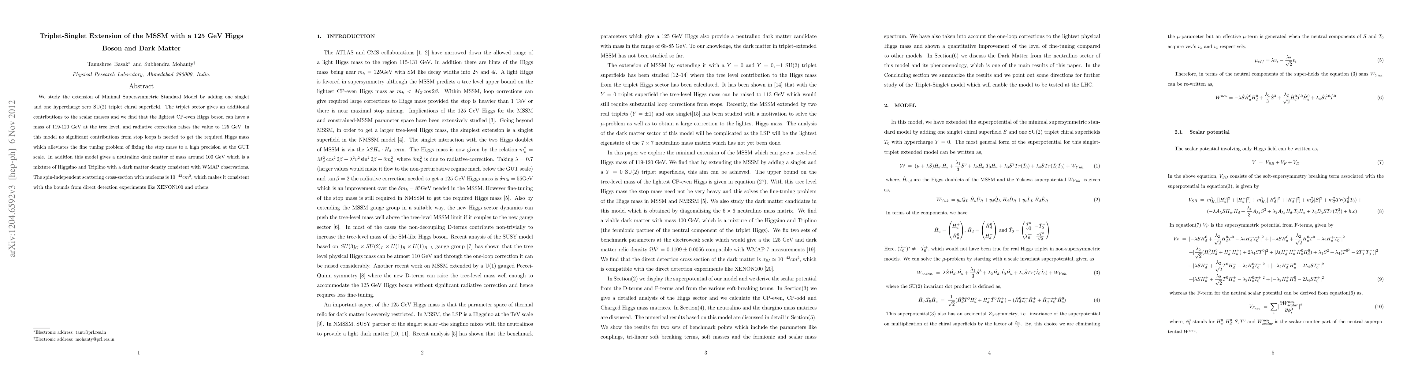 This paper explores an extension of the Minimal Supersymmetric Standard Model (MSSM) by incorporating a singlet and a SU(2) triplet chiral superfield, achieving a 125 GeV Higgs mass through radiative corrections without significant stop loop contributions, thus reducing fine-tuning. The model also predicts a neutralino dark matter candidate of around 100 GeV, consistent with observational and experimental constraints.