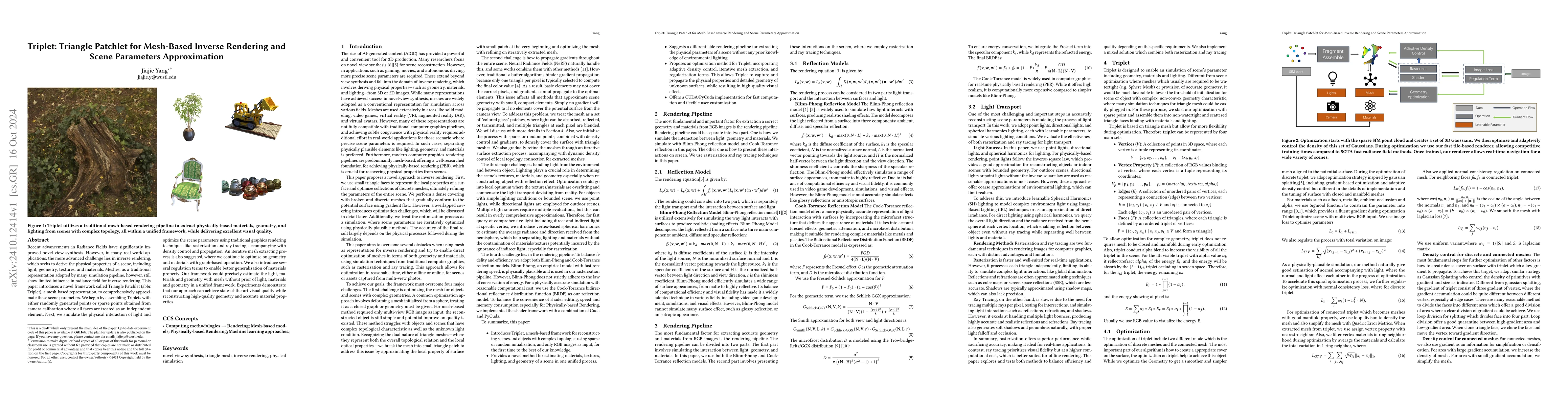 Recent advancements in Radiance Fields have significantly improved novel-view synthesis. However, in many real-world applications, the more advanced challenge lies in inverse rendering, which seeks to derive the physical properties of a scene, including light, geometry, textures, and materials. Meshes, as a traditional representation adopted by many simulation pipeline, however, still show limited influence in radiance field for inverse rendering. This paper introduces a novel framework called Triangle Patchlet (abbr. Triplet), a mesh-based representation, to comprehensively approximate these scene parameters. We begin by assembling Triplets with either randomly generated points or sparse points obtained from camera calibration where all faces are treated as an independent element. Next, we simulate the physical interaction of light and optimize the scene parameters using traditional graphics rendering techniques like rasterization and ray tracing, accompanying with density control and propagation. An iterative mesh extracting process is also suggested, where we continue to optimize on geometry and materials with graph-based operation. We also introduce several regulation terms to enable better generalization of materials property. Our framework could precisely estimate the light, materials and geometry with mesh without prior of light, materials and geometry in a unified framework. Experiments demonstrate that our approach can achieve state-of-the-art visual quality while reconstructing high-quality geometry and accurate material properties.