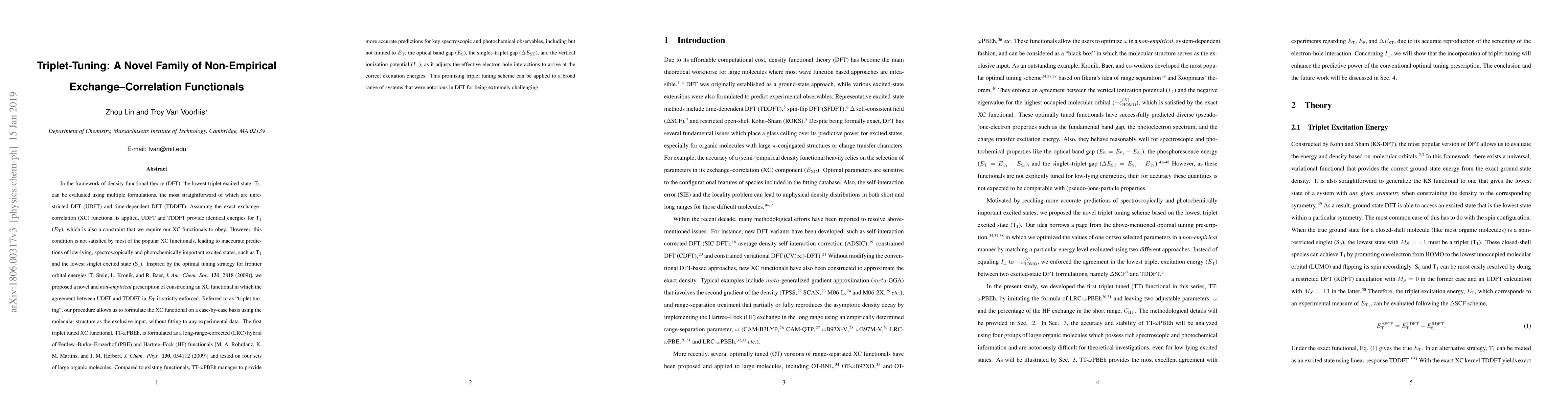 The research introduces 'triplet tuning', a novel non-empirical method to construct exchange-correlation (XC) functionals in Density Functional Theory (DFT). This method ensures the agreement between UDFT and TDDFT energies for the lowest triplet excited state (T1), improving predictions for crucial excited states like T1 and S1. The first triplet-tuned functional, TT-ωPBEh, demonstrates enhanced accuracy for spectroscopic and photochemical observables compared to existing functionals, showing promise for challenging systems in DFT.