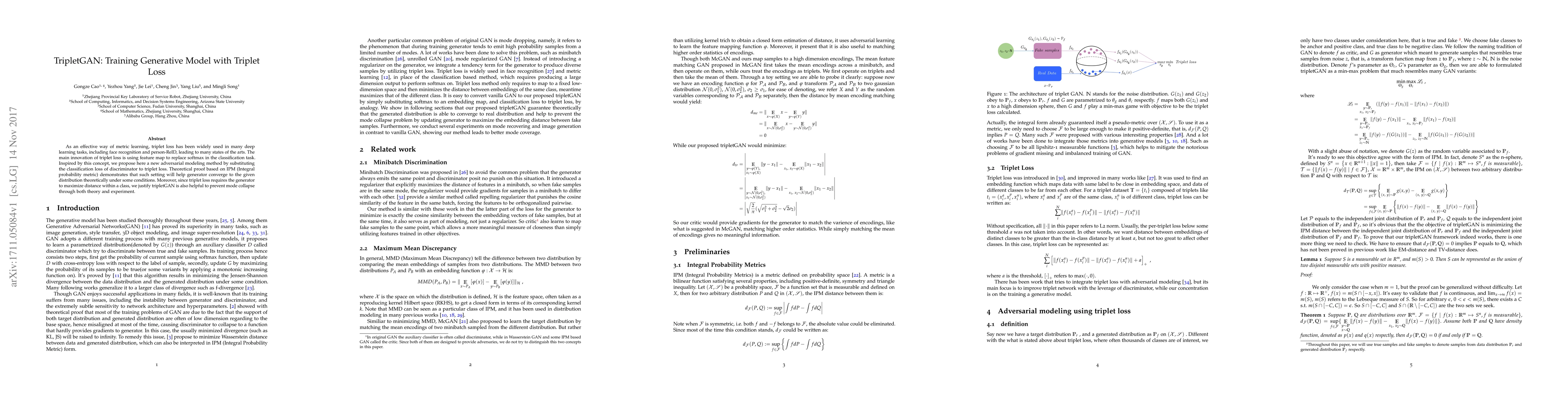 As an effective way of metric learning, triplet loss has been widely used in many deep learning tasks, including face recognition and person-ReID, leading to many states of the arts. The main innovation of triplet loss is using feature map to replace softmax in the classification task. Inspired by this concept, we propose here a new adversarial modeling method by substituting the classification loss of discriminator with triplet loss. Theoretical proof based on IPM (Integral probability metric) demonstrates that such setting will help the generator converge to the given distribution theoretically under some conditions. Moreover, since triplet loss requires the generator to maximize distance within a class, we justify tripletGAN is also helpful to prevent mode collapse through both theory and experiment.