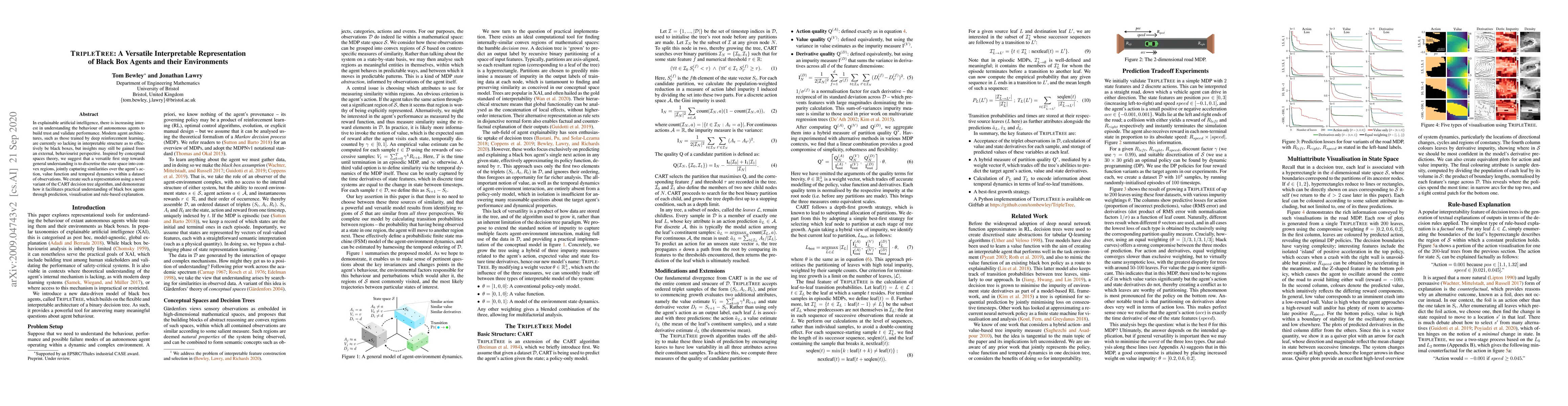 Title: TripleTree: A Versatile Interpretable Representation of Black Box Agents and their Environments Summary: This paper introduces TripleTree, a novel decision tree algorithm that discretizes the state space of black box agents into convex regions, providing insights into their behavior through prediction, visualization, and rule-based explanations, thereby enhancing interpretability and trust in autonomous agents.