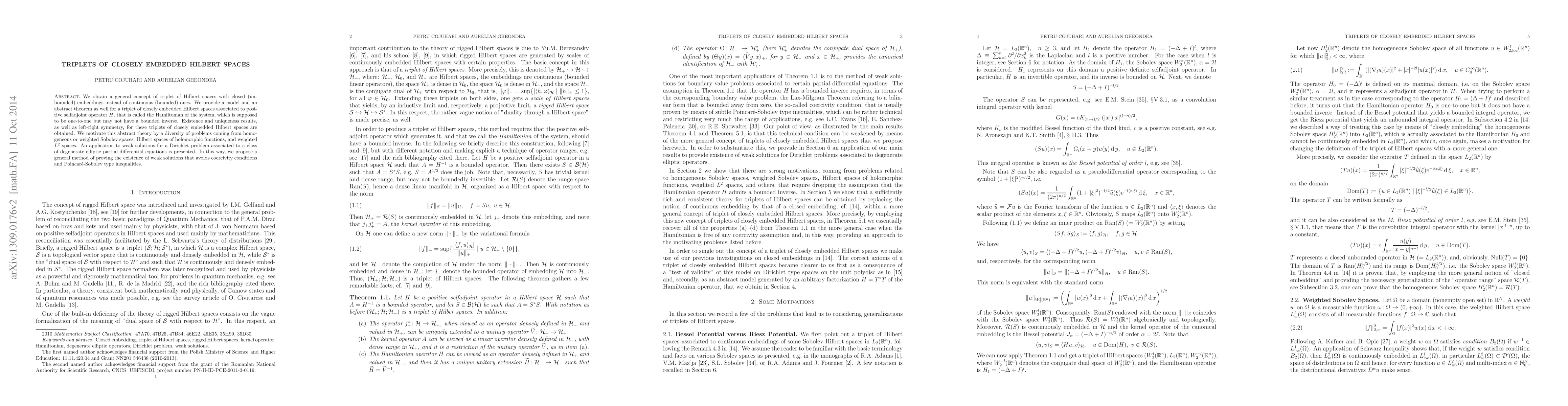 We obtain a general concept of triplet of Hilbert spaces with closed (unbounded) embeddings instead of continuous (bounded) ones. The construction starts with a positive selfadjoint operator $H$, that is called the Hamiltonian of the system, which is supposed to be one-to-one but may not have a bounded inverse, and for which a model is obtained. From this model we get the abstract concept and show that its basic properties are the same with those of the model. Existence and uniqueness results, as well as left-right symmetry, for these triplets of closely embedded Hilbert spaces are obtained. We motivate this abstract theory by a diversity of problems coming from homogeneous or weighted Sobolev spaces, Hilbert spaces of holomorphic functions, and weighted $L^2$ spaces. An application to weak solutions for a Dirichlet problem associated to a class of degenerate elliptic partial differential equations is presented. In this way, we propose a general method of proving the existence of weak solutions that avoids coercivity conditions and Poincar\'e-Sobolev type inequalities.
