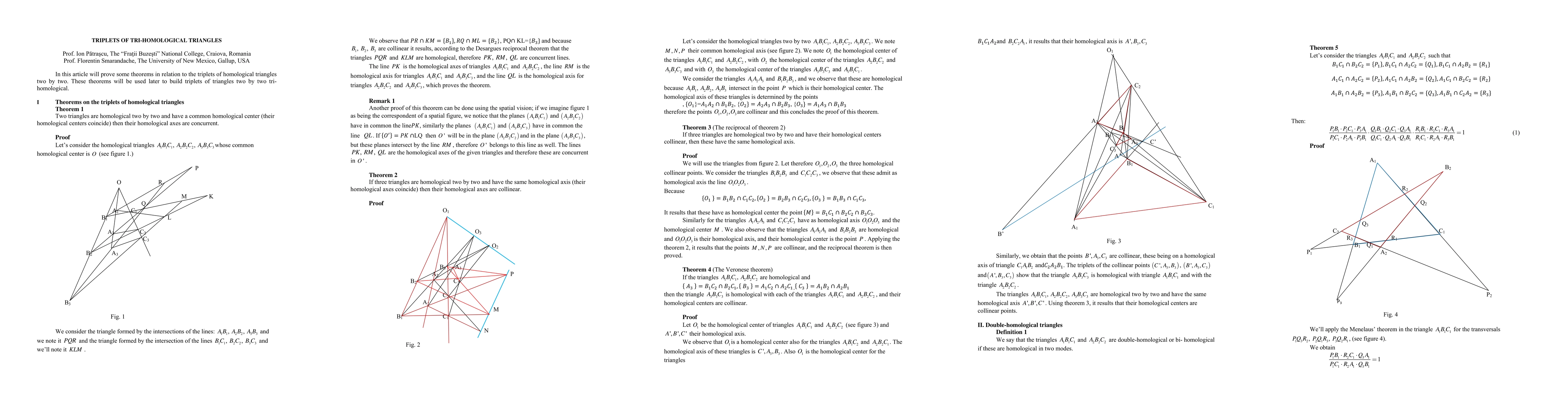 Summary: This paper proves theorems concerning triplets of tri-homological triangles, establishing foundational relationships between them. These theorems are intended to facilitate the construction of complex triplets of triangles with tri-homological properties.