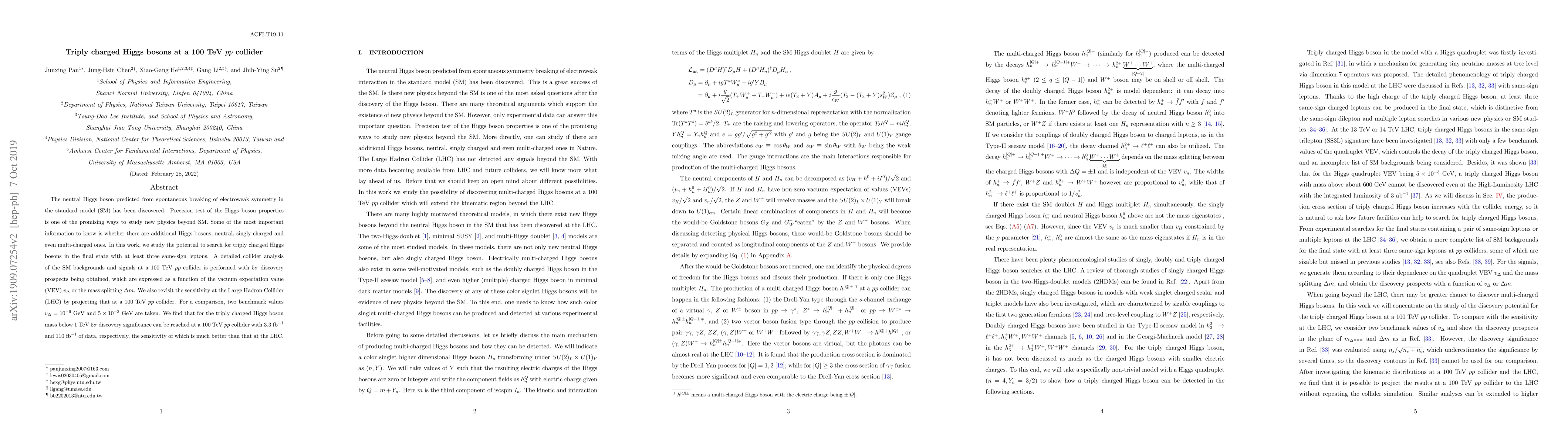 This paper investigates the potential for discovering triply charged Higgs bosons at a 100 TeV proton-proton collider, focusing on final states with three same-sign leptons. It demonstrates that a 5σ discovery can be achieved for masses below 1 TeV, significantly outperforming the Large Hadron Collider's sensitivity.