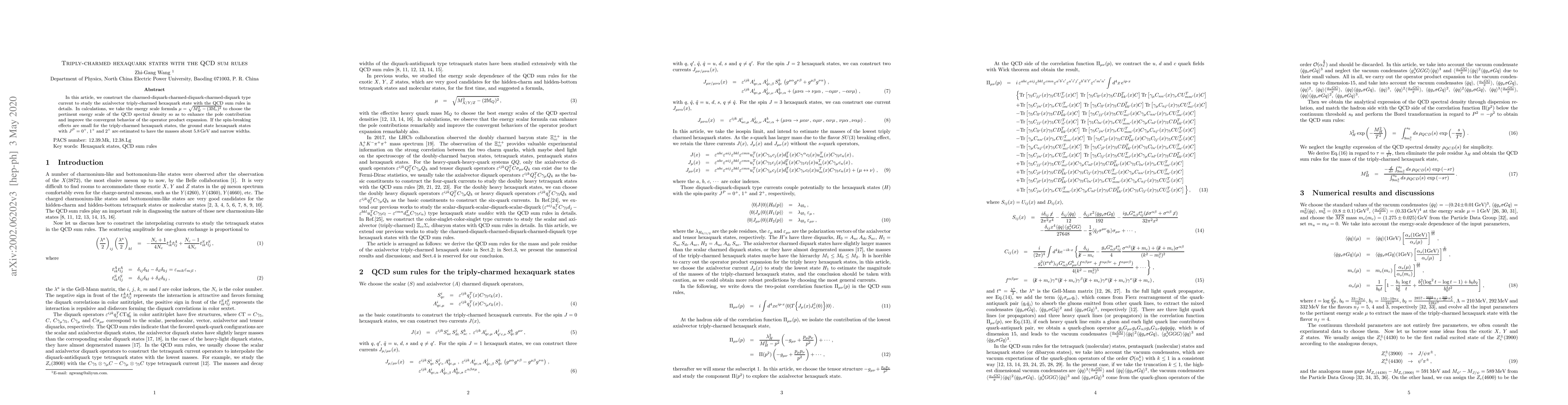 In this article, we construct the charmed-diquark-charmed-diquark-charmed-diquark type current to study the axialvector triply-charmed hexaquark state with the QCD sum rules in details. In calculations, we take the energy scale formula $\mu=\sqrt{M^2_{H}-(3{\mathbb{M}}_c)^2}$ to choose the pertinent energy scale of the QCD spectral density so as to enhance the pole contribution and improve the convergent behavior of the operator product expansion. If the spin-breaking effects are small for the triply-charmed hexaquark states, the ground state hexaquark states with $J^P=0^+$, $1^+$ and $2^+$ are estimated to have the masses about $5.8\,\rm{GeV}$ and narrow widths.