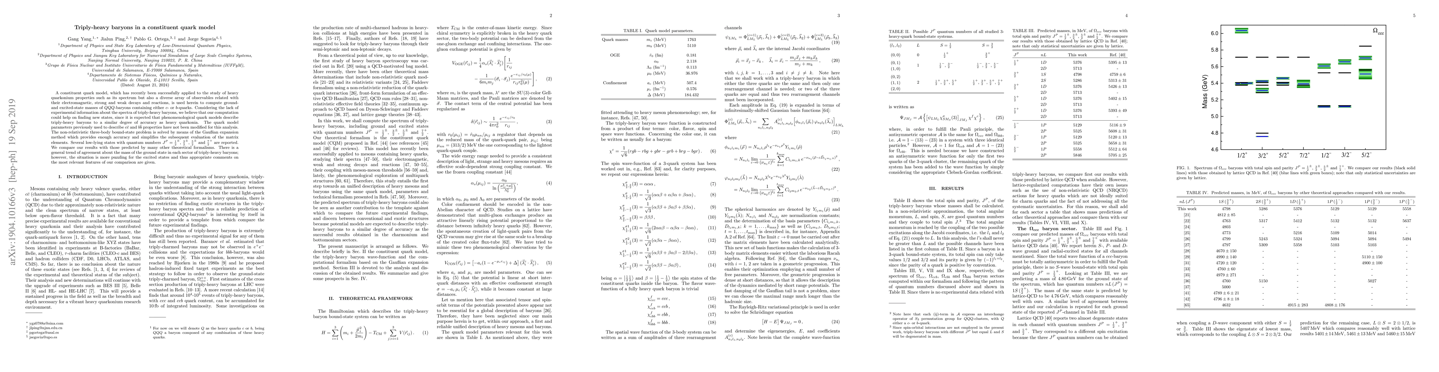 A constituent quark model, which has recently been successfully applied to the study of heavy quarkonium properties such as its spectrum but also a diverse array of observables related with their electromagnetic, strong and weak decays and reactions, is used herein to compute ground- and excited-state masses of $QQQ$-baryons containing either $c$- or $b$-quarks. Considering the lack of experimental information about the spectra of triply-heavy baryons, we believe that our computation could help on finding new states, since it is expected that phenomenological quark models describe triply-heavy baryons to a similar degree of accuracy as heavy quarkonia. The quark model parameters previously used to describe $c\bar c$ and $b\bar b$ properties have not been modified for this analysis. The non-relativistic three-body bound-state problem is solved by means of the Gau\ss ian expansion method which provides enough accuracy and simplifies the subsequent evaluation of the matrix elements. Several low-lying states with quantum numbers $J^P=\frac{1}{2}^{\pm}$, $\frac{3}{2}^{\pm}$, $\frac{5}{2}^{\pm}$ and $\frac{7}{2}^+$ are reported. We compare our results with those predicted by many other theoretical formalisms. There is a general trend of agreement about the mass of the ground state in each sector of triply-heavy baryons; however, the situation is more puzzling for the excited states and thus appropriate comments on the most relevant features of our comparison are given.