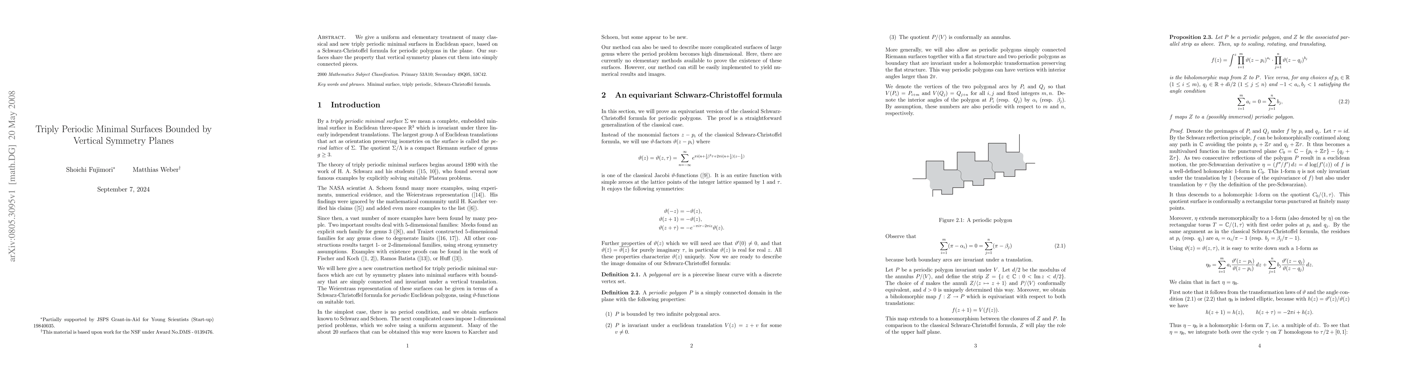 This paper presents a comprehensive study of various classical and novel triply periodic minimal surfaces using a Schwarz-Christoffel formula, highlighting their unique property of being divided into simply connected pieces by vertical symmetry planes.