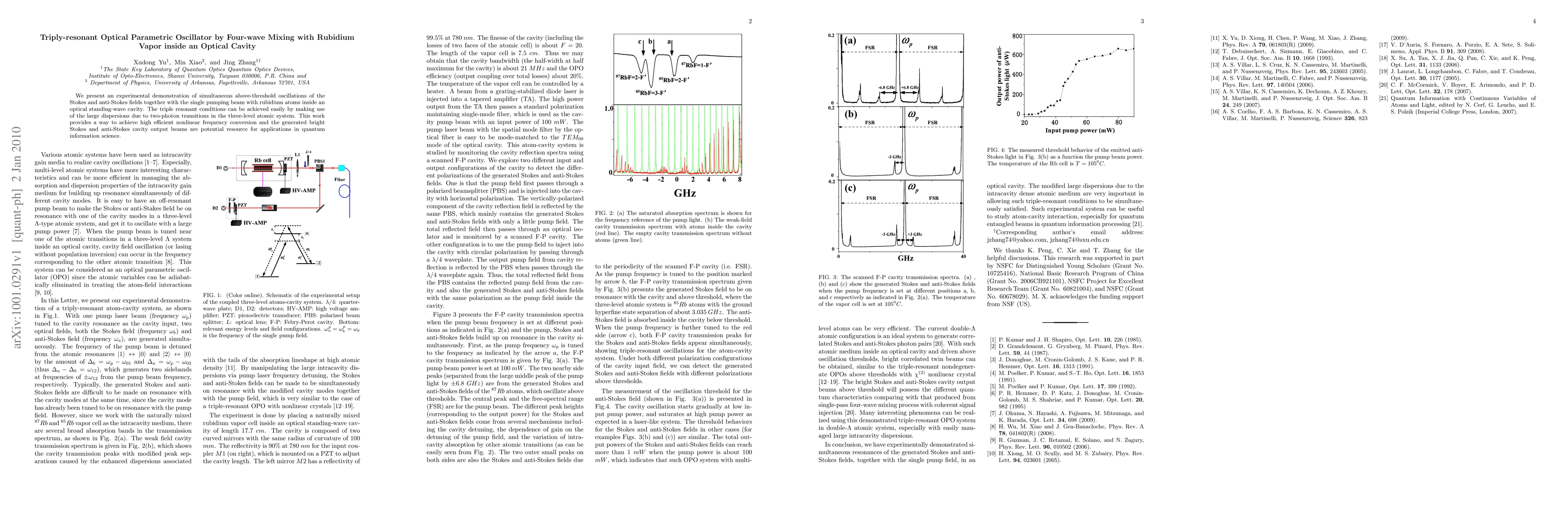This paper demonstrates a triply-resonant optical parametric oscillator using four-wave mixing with rubidium vapor in an optical cavity, achieving simultaneous oscillations of Stokes and anti-Stokes fields with high efficiency. The method leverages large dispersions from two-photon transitions in a three-level atomic system, offering potential for quantum information applications.