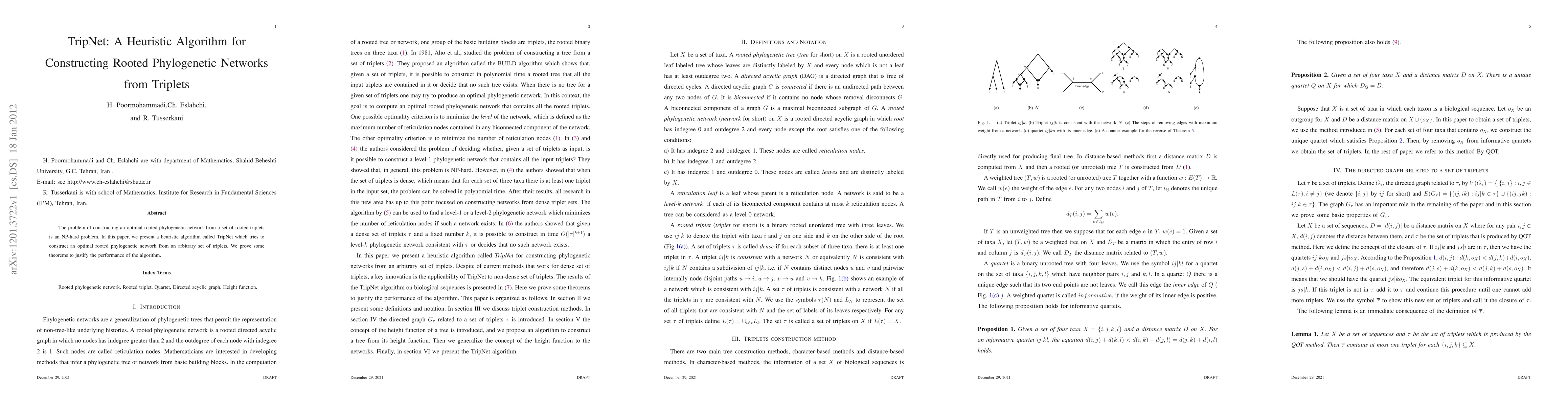 Summary: TripNet is a heuristic algorithm designed to construct rooted phylogenetic networks from triplets, addressing the NP-hard problem. The paper includes theorems to validate the algorithm's performance and effectiveness.