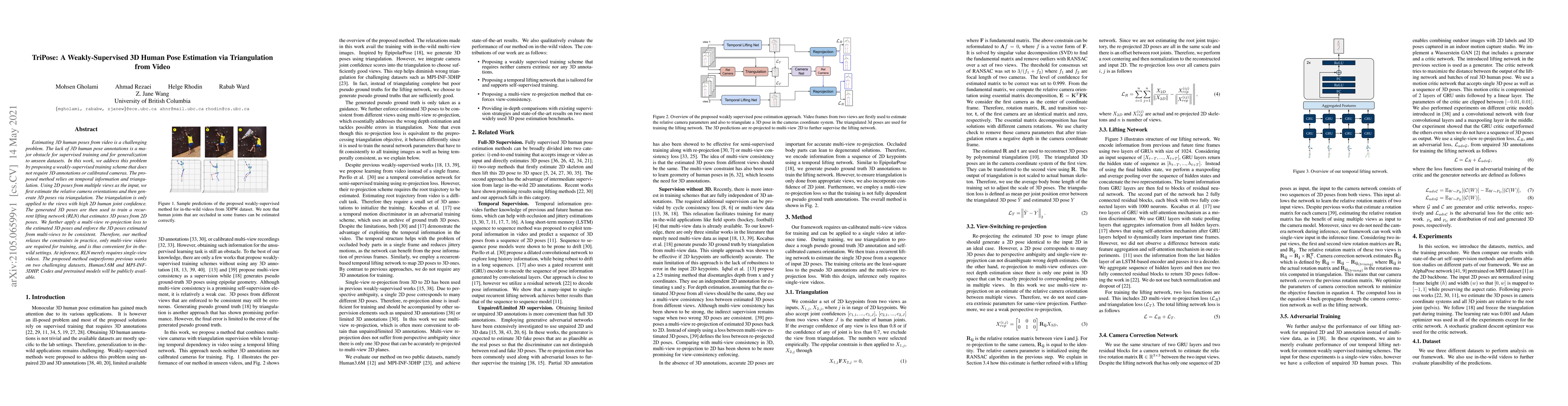 TriPose introduces a weakly-supervised method for 3D human pose estimation from video using triangulation and temporal information, without requiring 3D annotations or calibrated cameras. The method trains a recurrent lifting network using 2D poses from multiple views to generate and refine 3D poses, achieving better performance on Human3.6M and MPI-INF-3DHP datasets.