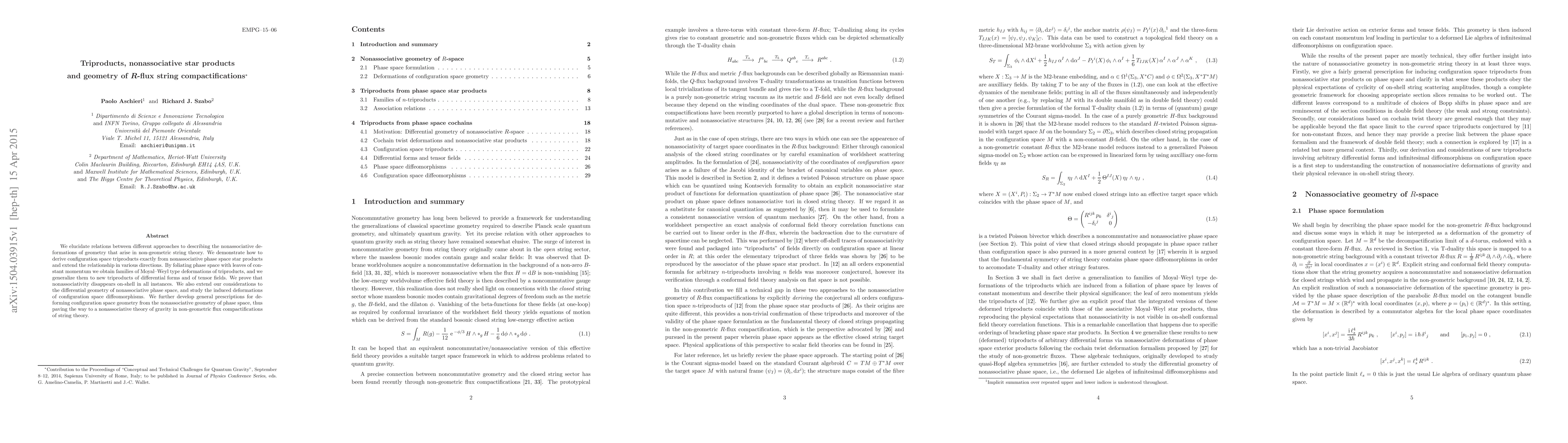 We elucidate relations between different approaches to describing the nonassociative deformations of geometry that arise in non-geometric string theory. We demonstrate how to derive configuration space triproducts exactly from nonassociative phase space star products and extend the relationship in various directions. By foliating phase space with leaves of constant momentum we obtain families of Moyal-Weyl type deformations of triproducts, and we generalize them to new triproducts of differential forms and of tensor fields. We prove that nonassociativity disappears on-shell in all instances. We also extend our considerations to the differential geometry of nonassociative phase space, and study the induced deformations of configuration space diffeomorphisms. We further develop general prescriptions for deforming configuration space geometry from the nonassociative geometry of phase space, thus paving the way to a nonassociative theory of gravity in non-geometric flux compactifications of string theory.