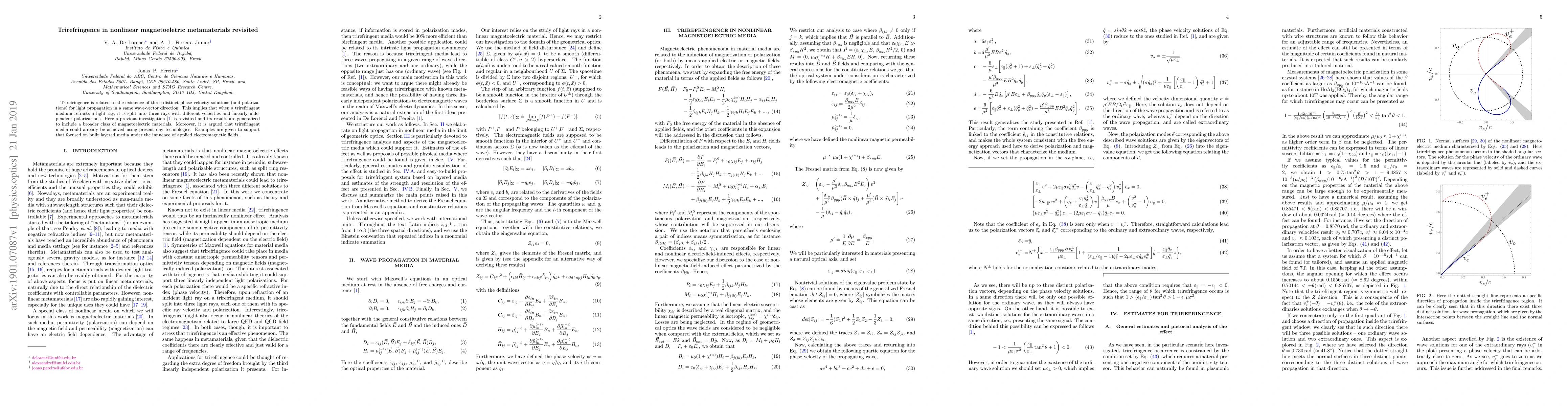 This paper revisits and generalizes previous findings on trirefringence in nonlinear magnetoelectric metamaterials, demonstrating that trirefringent media can split light into three rays with different velocities and polarizations. It argues that current technologies can already achieve such media, particularly through layered structures influenced by electromagnetic fields.
