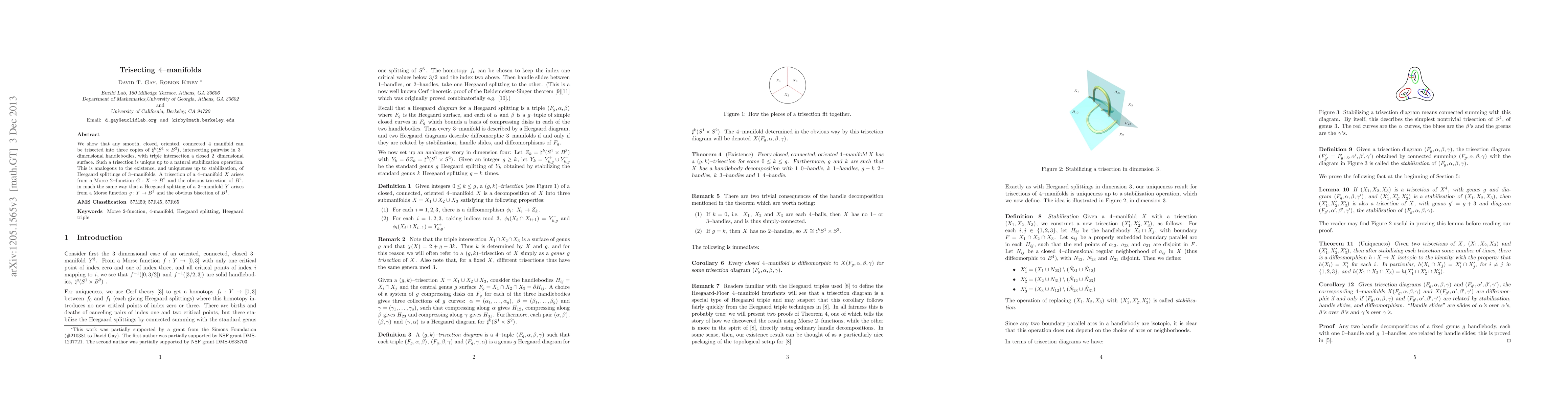 The paper demonstrates that any smooth, closed, oriented 4-manifold can be trisected into three connected components, analogous to Heegaard splittings of 3-manifolds, with a unique trisection up to stabilization, derived from a Morse 2-function.