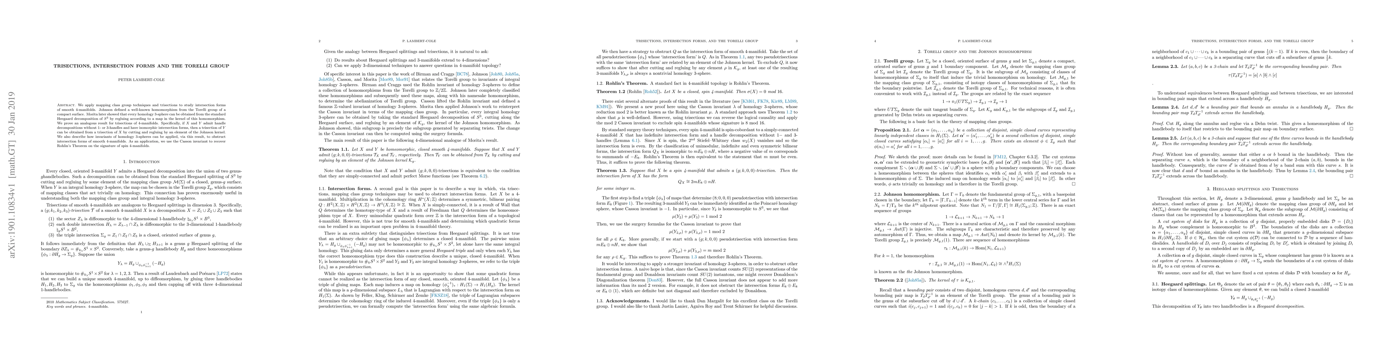 This paper uses mapping class group techniques and trisections to study intersection forms of smooth 4-manifolds, proving that trisections of homology 3-spheres can be obtained by regluing according to elements in the Johnson kernel. It also applies the Casson invariant to recover Rohlin's Theorem on the signature of spin 4-manifolds.