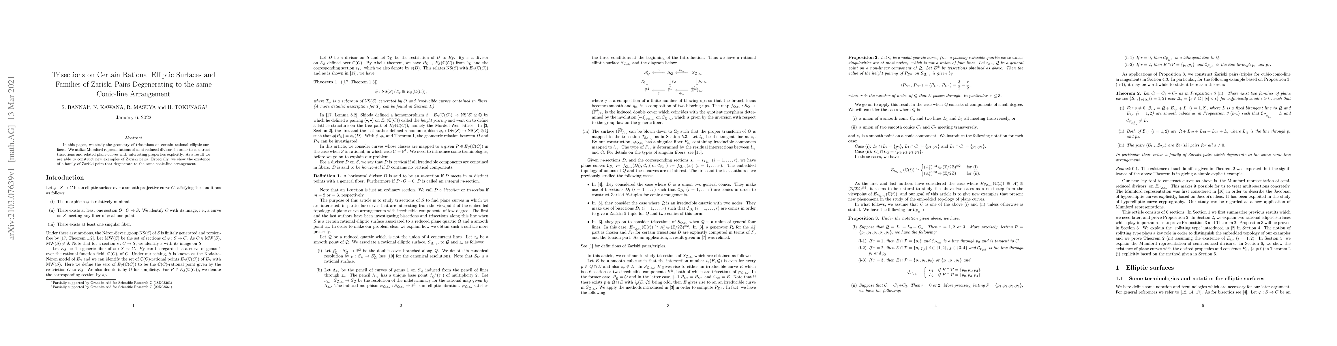 This paper investigates trisections on specific rational elliptic surfaces, employing Mumford representations to explicitly construct related plane curves and new Zariski pairs. It reveals a family of Zariski pairs that all degenerate to the same conic-line arrangement.