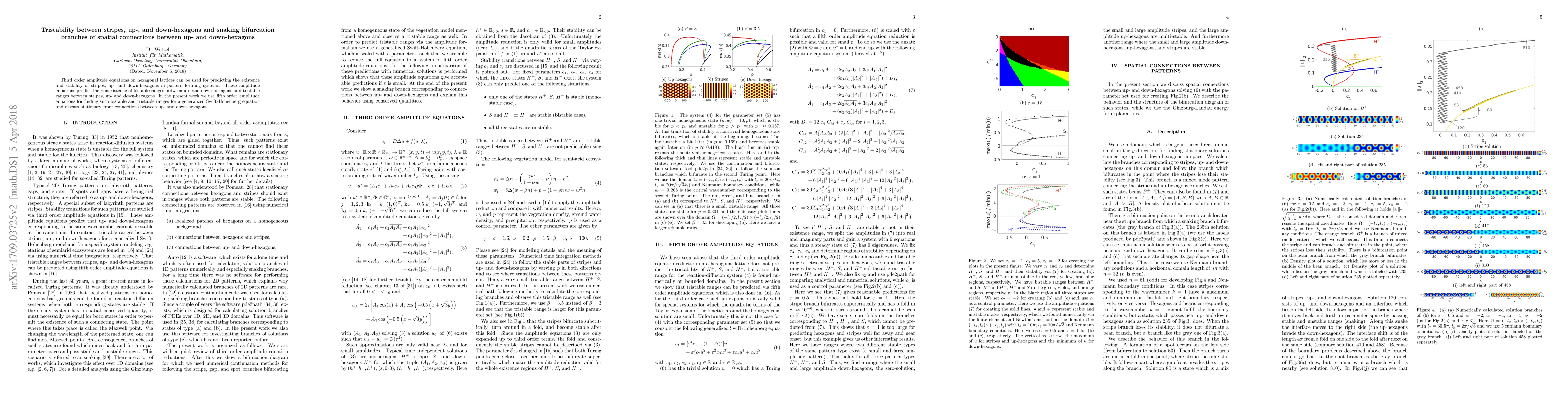 This research uses fifth order amplitude equations to predict bistable and tristable ranges in pattern forming systems on hexagonal lattices, focusing on connections between up- and down-hexagons, unlike third order equations which previously suggested nonexistence of bistability between up- and down-hexagons.