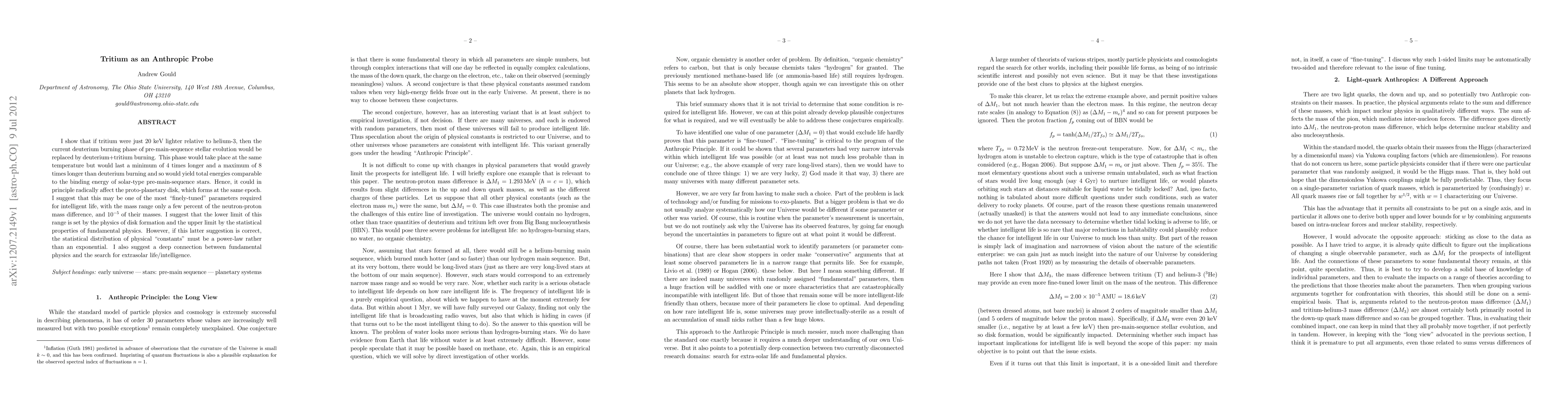 I show that if tritium were just 20 keV lighter relative to helium-3, then the current deuterium burning phase of pre-main-sequence stellar evolution would be replaced by deuterium+tritium burning. This phase would take place at the same temperature but would last a minimum of 4 times longer and a maximum of 8 times longer than deuterium burning and so would yield total energies comparable to the binding energy of solar-type pre-main-sequence stars. Hence, it could in principle radically affect the proto-planetary disk, which forms at the same epoch. I suggest that this may be one of the most "finely-tuned" parameters required for intelligent life, with the mass range only a few percent of the neutron-proton mass difference, and 10^{-5} of their masses. I suggest that the lower limit of this range is set by the physics of disk formation and the upper limit by the statistical properties of fundamental physics. However, if this latter suggestion is correct, the statistical distribution of physical "constants" must be a power-law rather than an exponential. I also suggest a deep connection between fundamental physics and the search for extrasolar life/intelligence.