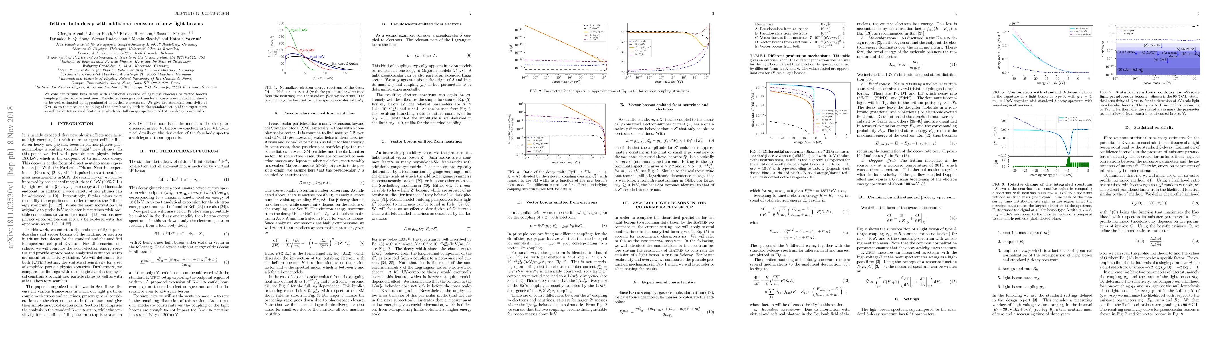 This paper investigates tritium beta decay with the emission of new light pseudoscalar or vector bosons, evaluating the electron energy spectrum and providing analytical estimates. It also assesses the KATRIN experiment's sensitivity to the mass and coupling of these new bosons, considering both current and future experimental setups.
