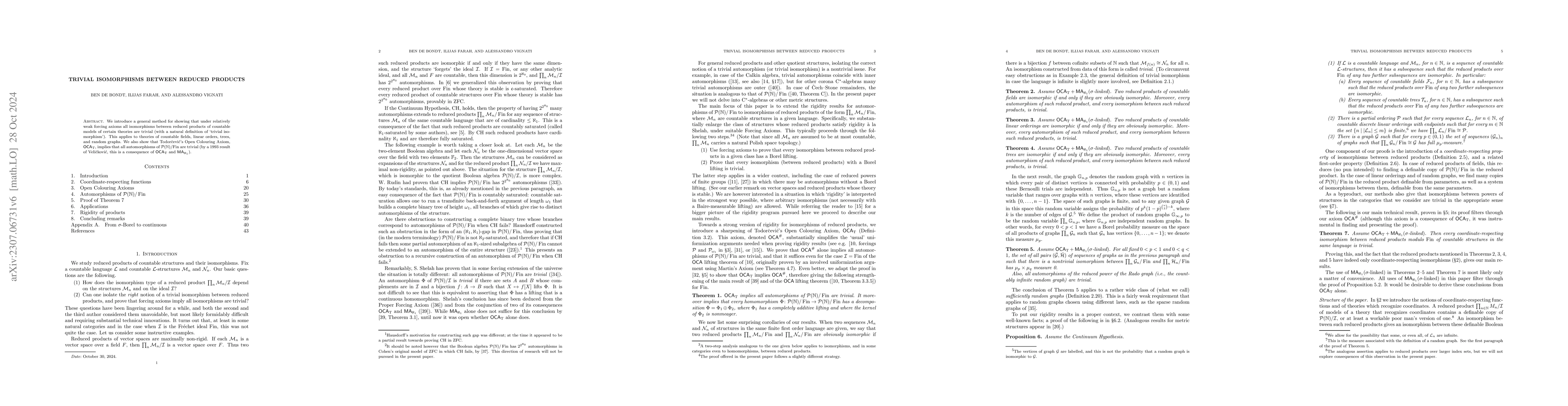 We introduce a general method for showing under weak forcing axioms that reduced products of countable models of a theory $T$ have as few automorphisms as possible. We show that such forcing axioms imply that reduced products of countably infinite or finite fields, linear orders, trees, or random graphs have only trivial automorphisms.