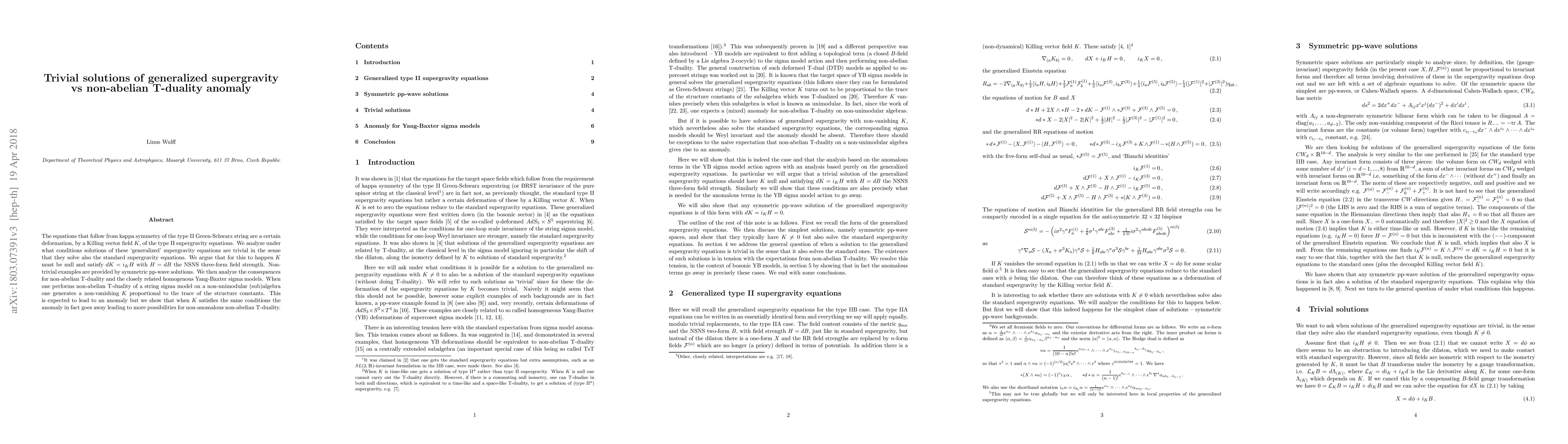 The equations that follow from kappa symmetry of the type II Green-Schwarz string are a certain deformation, by a Killing vector field $K$, of the type II supergravity equations. We analyze under what conditions solutions of these `generalized' supergravity equations are trivial in the sense that they solve also the standard supergravity equations. We argue that for this to happen $K$ must be null and satisfy $dK=i_KH$ with $H=dB$ the NSNS three-form field strength. Non-trivial examples are provided by symmetric pp-wave solutions. We then analyze the consequences for non-abelian T-duality and the closely related homogenous Yang-Baxter sigma models. When one performs non-abelian T-duality of a string sigma model on a non-unimodular (sub)algebra one generates a non-vanishing $K$ proportional to the trace of the structure constants. This is expected to lead to an anomaly but we show that when $K$ satisfies the same conditions the anomaly in fact goes away leading to more possibilities for non-anomalous non-abelian T-duality.
