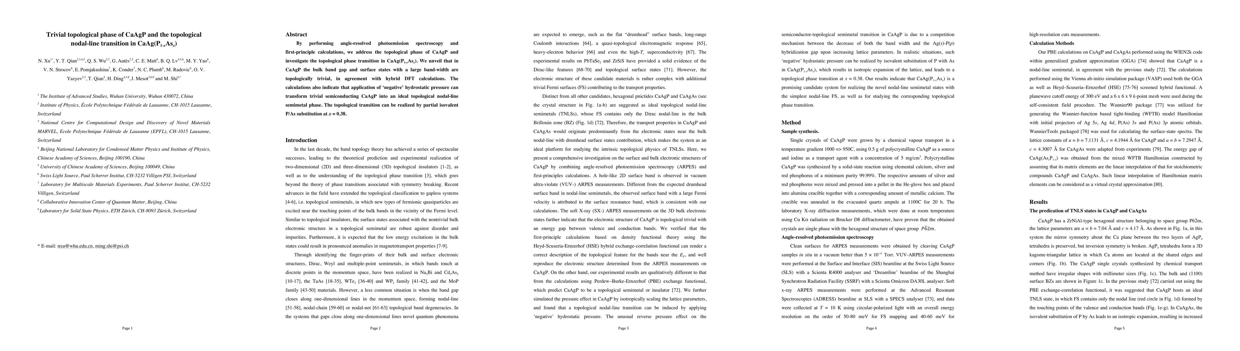 This study reveals that CaAgP is topologically trivial, with a bulk band gap and large bandwidth surface states, confirmed by hybrid density functional theory. It demonstrates that applying "negative" hydrostatic pressure or partial substitution of P by As (at x = 0.38) can transform CaAgP into a topological nodal-line semimetal phase.