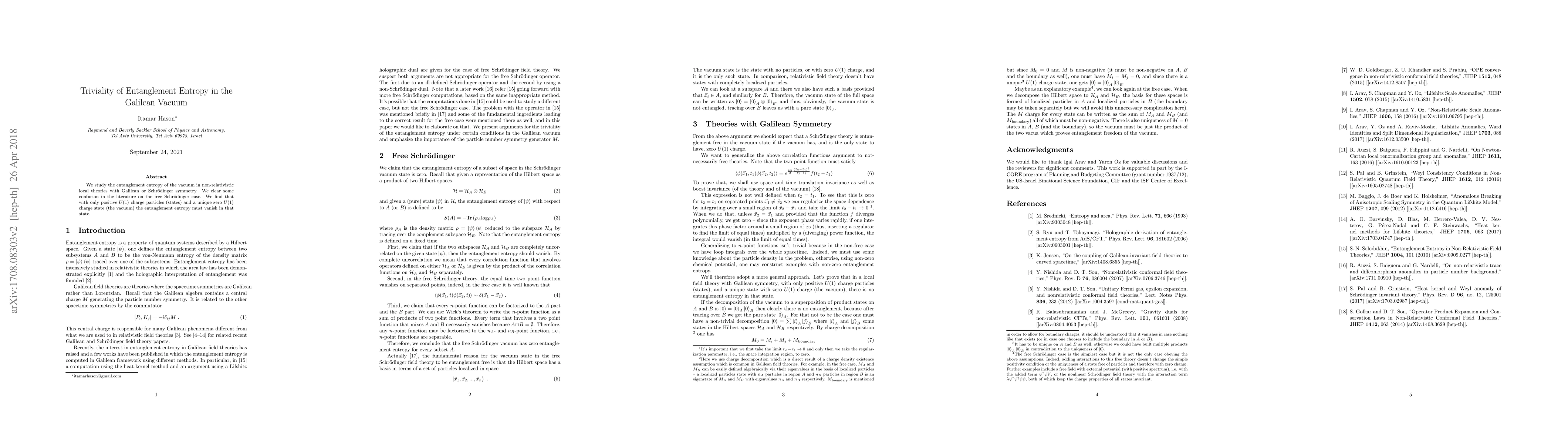 This paper investigates the entanglement entropy in non-relativistic theories with Galilean symmetry, resolving confusions about the free Schrödinger case. It concludes that in systems with only positive $U(1)$ charge particles and a unique zero $U(1)$ charge vacuum state, the entanglement entropy must be zero.