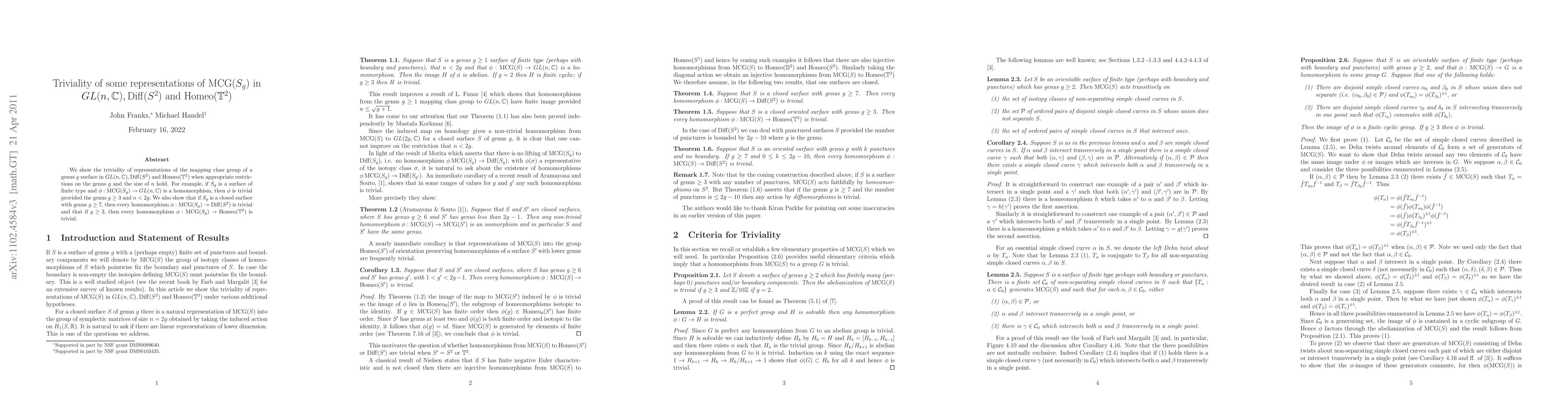 The paper shows that certain representations of the mapping class group of a surface in $GL(n,C), Diff(S^2)$ and $Homeo(T^2)$ are trivial under specific conditions on genus $g$ and size $n$, providing new insights into the structure of these groups.