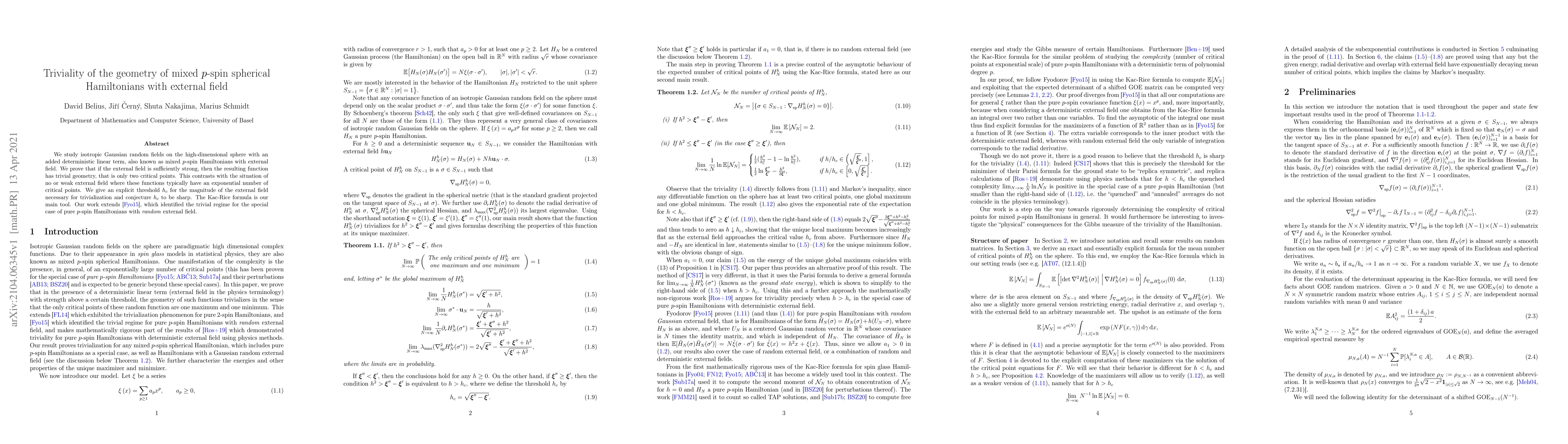 This research paper proves that a strong enough deterministic linear term (external field) in isotropic Gaussian random fields on a high-dimensional sphere simplifies the geometry, reducing the number of critical points from exponentially many to just two. The Kac-Rice formula is the primary method used, and the study extends previous work by identifying a specific threshold (h_c) for the external field's magnitude that leads to this trivialization.