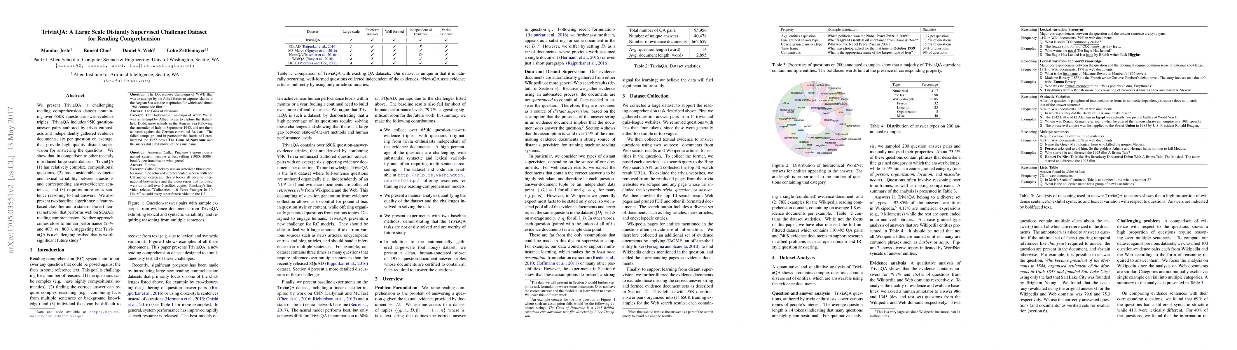 We present TriviaQA, a challenging reading comprehension dataset containing over 650K question-answer-evidence triples. TriviaQA includes 95K question-answer pairs authored by trivia enthusiasts and independently gathered evidence documents, six per question on average, that provide high quality distant supervision for answering the questions. We show that, in comparison to other recently introduced large-scale datasets, TriviaQA (1) has relatively complex, compositional questions, (2) has considerable syntactic and lexical variability between questions and corresponding answer-evidence sentences, and (3) requires more cross sentence reasoning to find answers. We also present two baseline algorithms: a feature-based classifier and a state-of-the-art neural network, that performs well on SQuAD reading comprehension. Neither approach comes close to human performance (23% and 40% vs. 80%), suggesting that TriviaQA is a challenging testbed that is worth significant future study. Data and code available at -- http://nlp.cs.washington.edu/triviaqa/