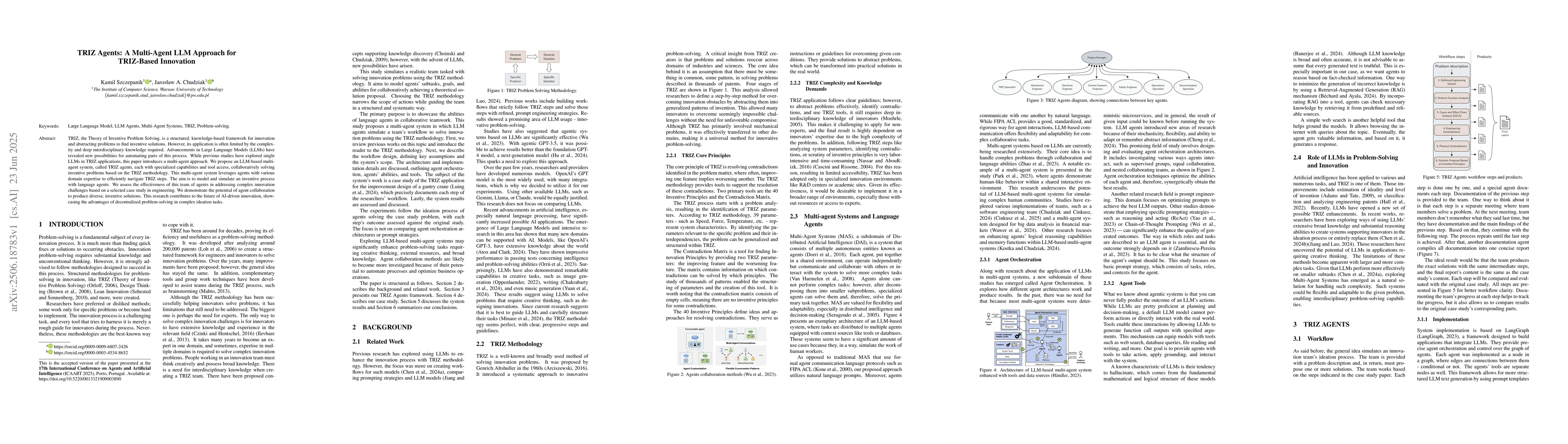 TRIZ, the Theory of Inventive Problem Solving, is a structured, knowledge-based framework for innovation and abstracting problems to find inventive solutions. However, its application is often limited by the complexity and deep interdisciplinary knowledge required. Advancements in Large Language Models (LLMs) have revealed new possibilities for automating parts of this process. While previous studies have explored single LLMs in TRIZ applications, this paper introduces a multi-agent approach. We propose an LLM-based multi-agent system, called TRIZ agents, each with specialized capabilities and tool access, collaboratively solving inventive problems based on the TRIZ methodology. This multi-agent system leverages agents with various domain expertise to efficiently navigate TRIZ steps. The aim is to model and simulate an inventive process with language agents. We assess the effectiveness of this team of agents in addressing complex innovation challenges based on a selected case study in engineering. We demonstrate the potential of agent collaboration to produce diverse, inventive solutions. This research contributes to the future of AI-driven innovation, showcasing the advantages of decentralized problem-solving in complex ideation tasks.