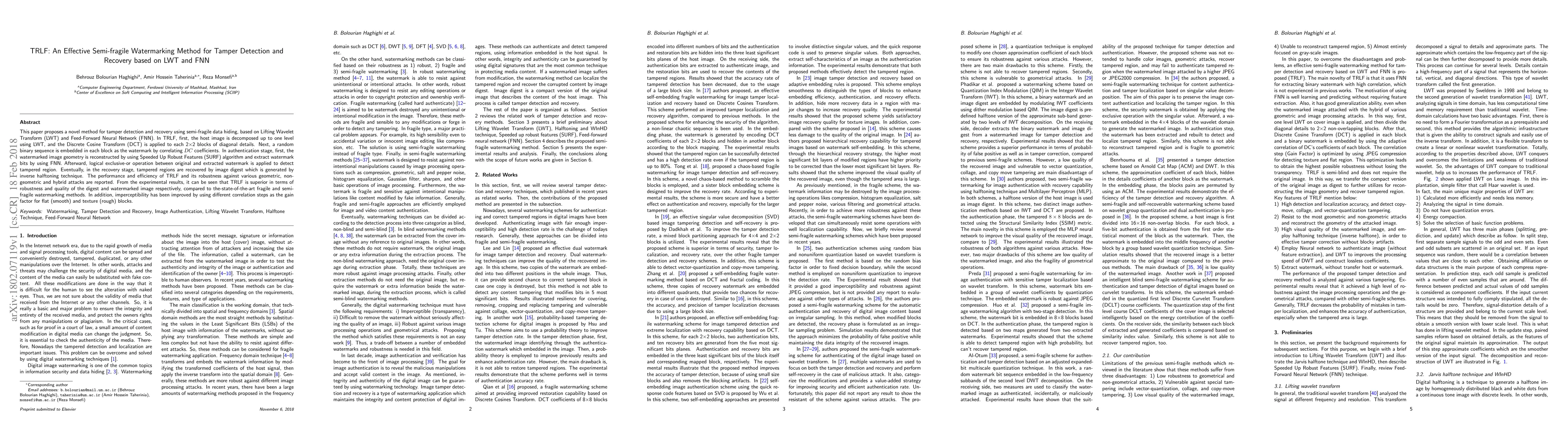This paper introduces TRLF, a semi-fragile watermarking method for tamper detection and recovery using LWT and FNN, showing superior robustness and quality compared to existing methods, and improving imperceptibility through adaptive gain factors.