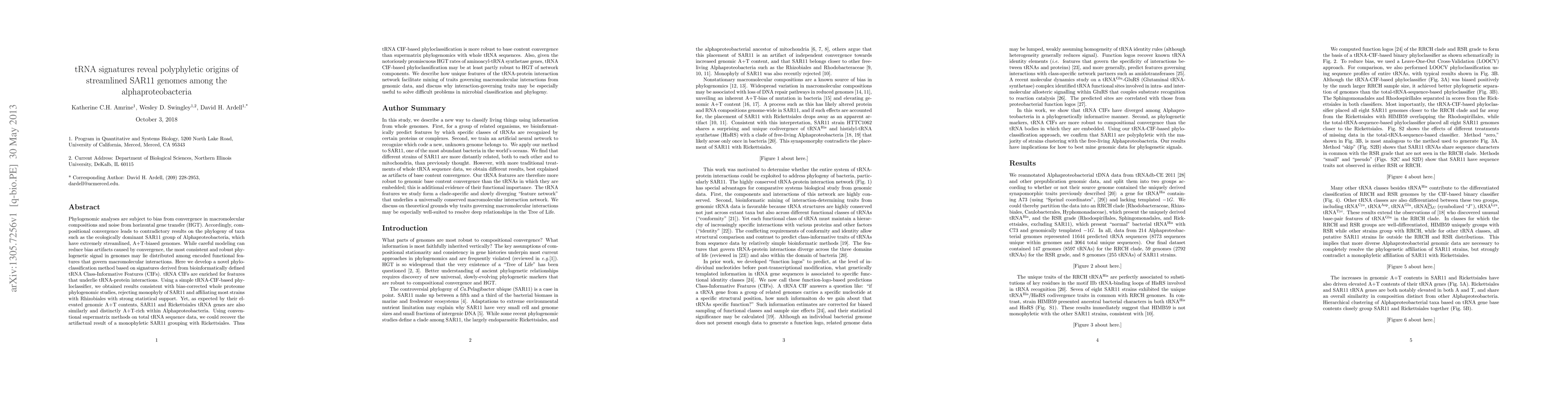 This paper develops a tRNA Class-Informative Features (CIF)-based phyloclassification method to reveal the polyphyletic origins of streamlined SAR11 genomes among Alphaproteobacteria, showing it is more robust to compositional convergence and horizontal gene transfer than conventional supermatrix methods. The study rejects monophyly of SAR11 and supports its affiliation with Rhizobiales, highlighting the utility of interaction-governing traits in microbial classification.