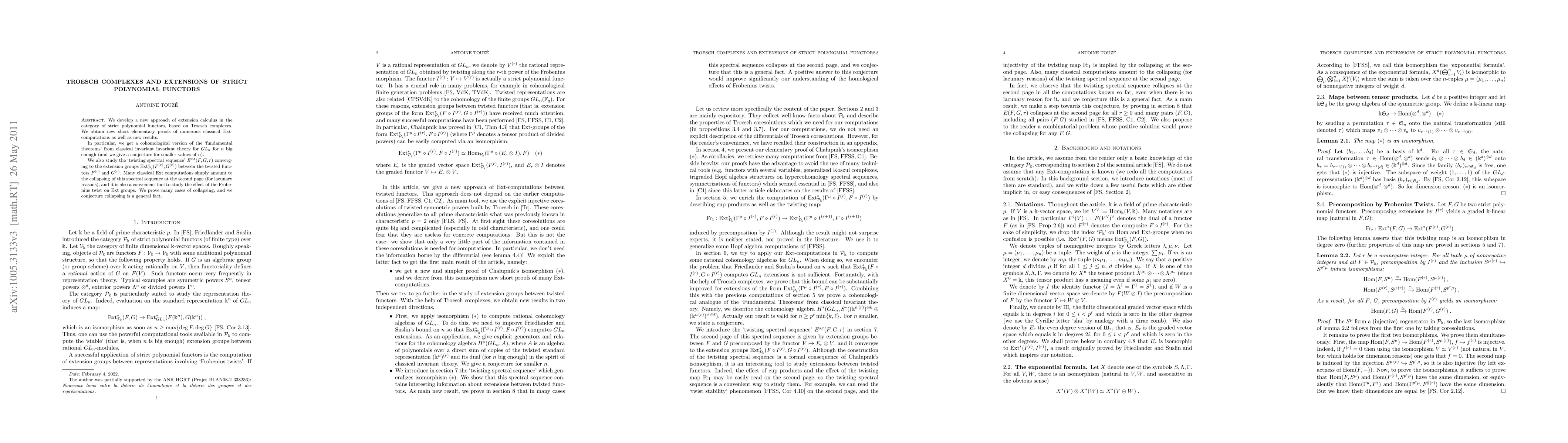 This paper introduces Troesch complexes to develop an extension calculus for strict polynomial functors, providing new proofs for classical Ext-computations and a cohomological version of fundamental theorems from invariant theory for GL_n. It also explores the 'twisting spectral sequence' converging to extension groups, proving many cases of its collapse and proposing a conjecture for its general applicability.