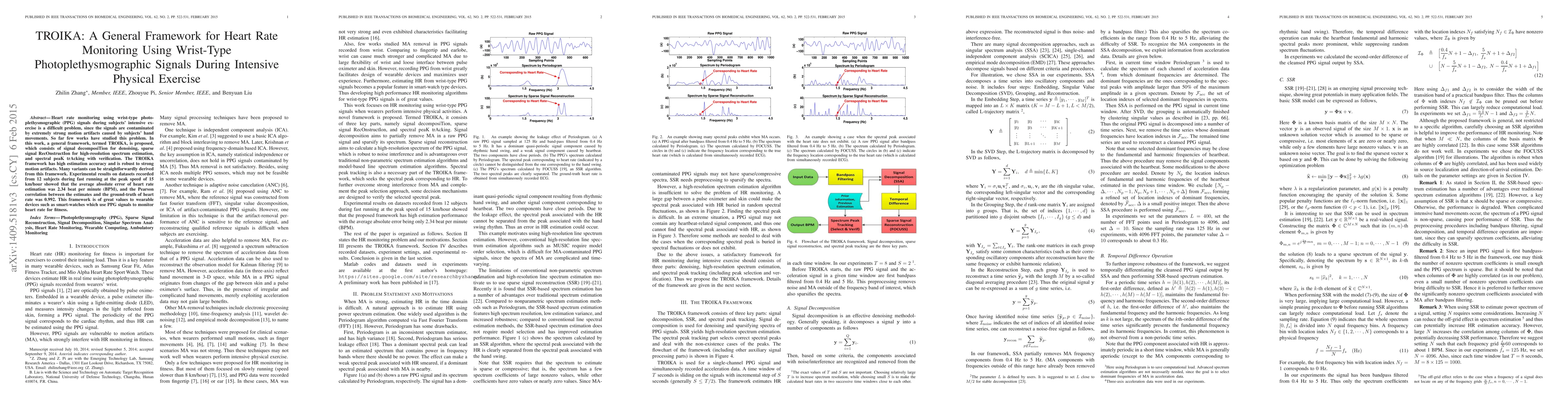 The TROIKA framework proposes a method for accurate heart rate monitoring via wrist-type photoplethysmographic signals during intense exercise, achieving high estimation accuracy with an average error of 2.34 BPM and a Pearson correlation of 0.992, despite strong motion artifacts.
