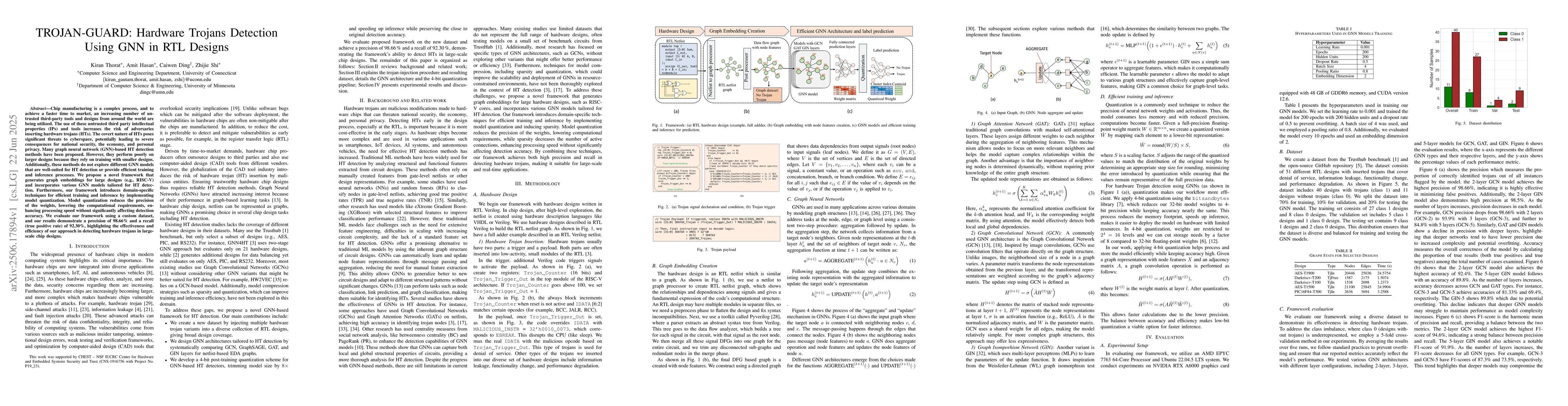 Chip manufacturing is a complex process, and to achieve a faster time to market, an increasing number of untrusted third-party tools and designs from around the world are being utilized. The use of these untrusted third party intellectual properties (IPs) and tools increases the risk of adversaries inserting hardware trojans (HTs). The covert nature of HTs poses significant threats to cyberspace, potentially leading to severe consequences for national security, the economy, and personal privacy. Many graph neural network (GNN)-based HT detection methods have been proposed. However, they perform poorly on larger designs because they rely on training with smaller designs. Additionally, these methods do not explore different GNN models that are well-suited for HT detection or provide efficient training and inference processes. We propose a novel framework that generates graph embeddings for large designs (e.g., RISC-V) and incorporates various GNN models tailored for HT detection. Furthermore, our framework introduces domain-specific techniques for efficient training and inference by implementing model quantization. Model quantization reduces the precision of the weights, lowering the computational requirements, enhancing processing speed without significantly affecting detection accuracy. We evaluate our framework using a custom dataset, and our results demonstrate a precision of 98.66% and a recall (true positive rate) of 92.30%, highlighting the effectiveness and efficiency of our approach in detecting hardware trojans in large-scale chip designs