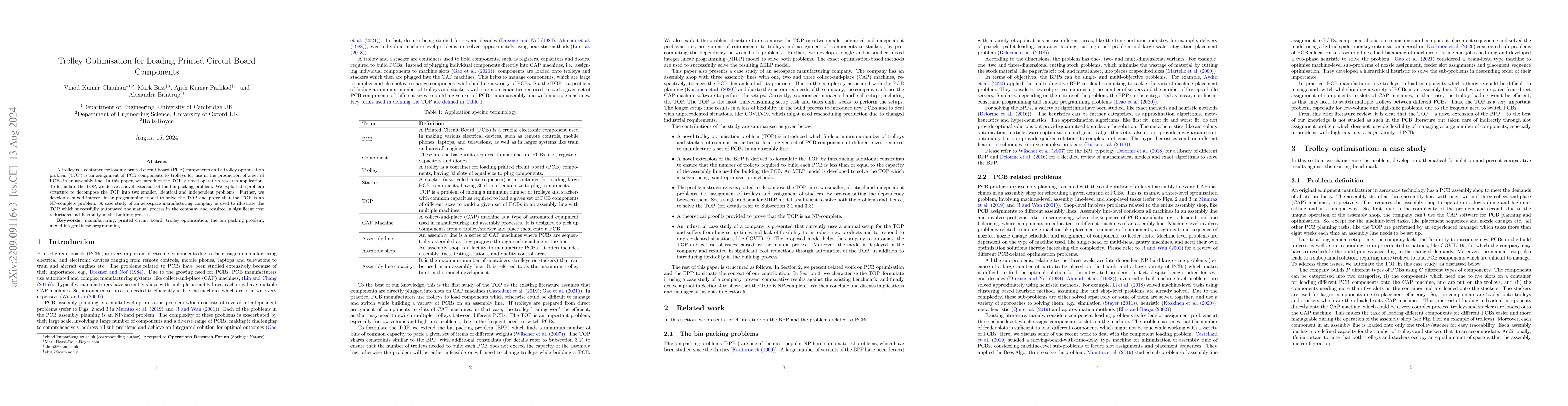 This paper introduces the Trolley Optimisation Problem (TOP), extending the bin packing problem to assign PCB components to trolleys for assembly line production. The authors decompose the TOP into smaller problems and develop a mixed integer linear programming model, proving it to be NP-complete, and demonstrate its effectiveness through a case study in an aerospace manufacturing company, achieving cost reductions and process flexibility.