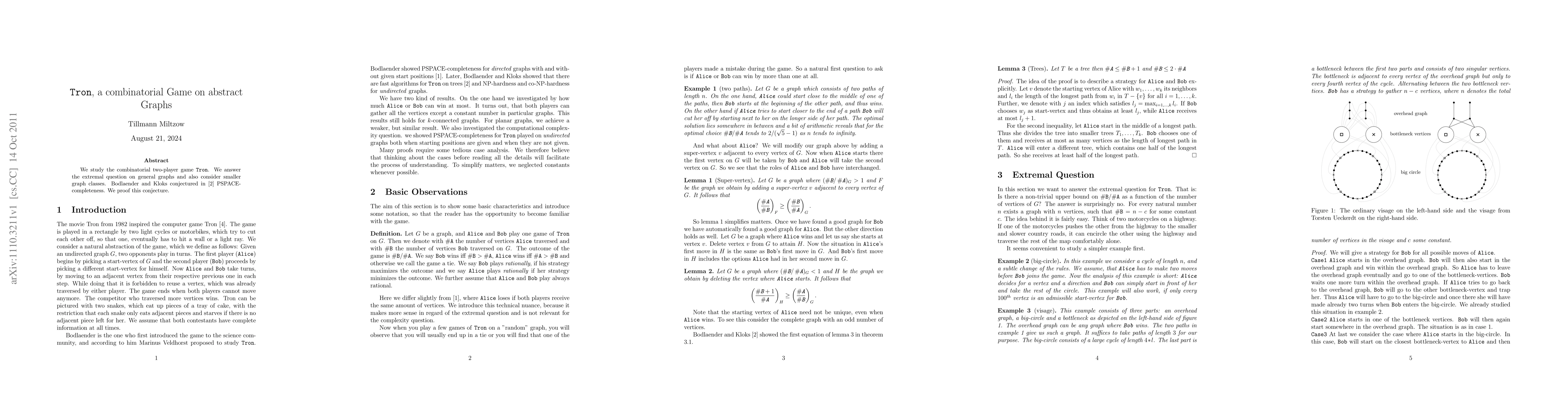 Summary: This paper investigates the combinatorial game Tron on abstract graphs, proving the conjecture by Bodlaender and Kloks that it is PSPACE-complete, and also addresses extremal questions on both general and specific graph classes.