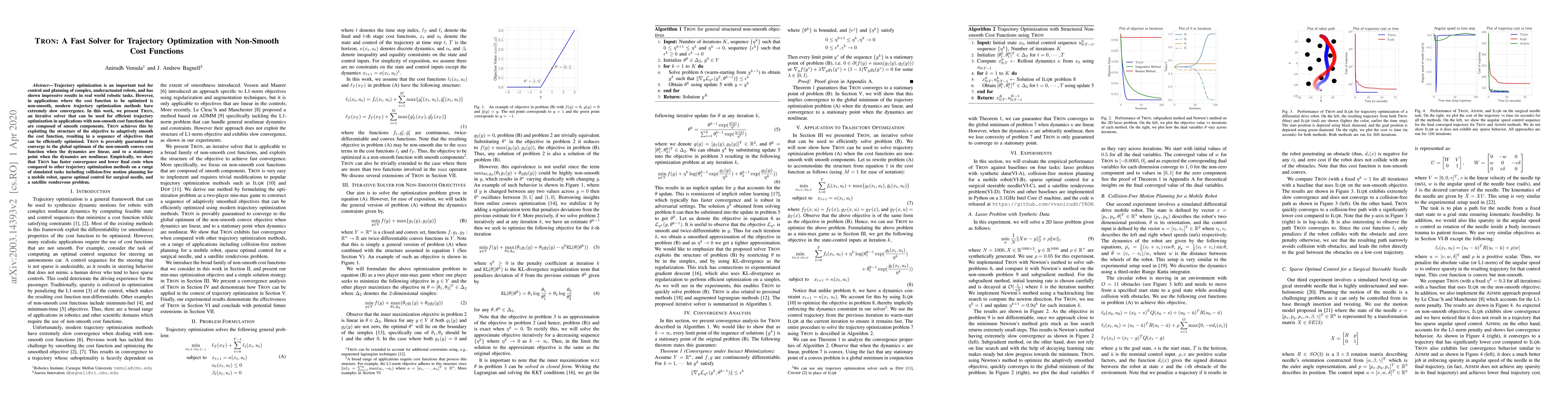 TRON is an efficient iterative solver for trajectory optimization with non-smooth cost functions, leveraging adaptive smoothing to achieve faster convergence and lower final costs compared to existing methods. It guarantees convergence to the global optimum for linear dynamics and to a stationary point for nonlinear dynamics.