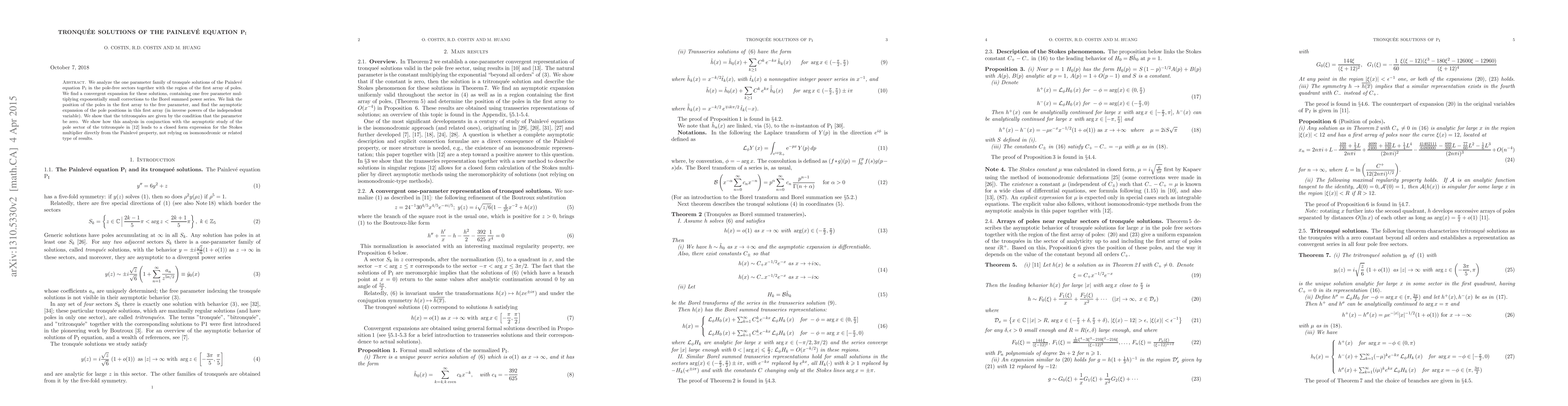 We analyze the one parameter family of tronqu\'ee solutions of the Painlev\'e equation \P1 in the pole-free sectors together with the region of the first array of poles. We find a convergent expansion for these solutions, containing one free parameter multiplying exponentially small corrections to the Borel summed power series. We link the position of the poles in the first array to the free parameter, and find the asymptotic expansion of the pole positions in this first array (in inverse powers of the independent variable). We show that the tritronqu\'ees are given by the condition that the parameter be zero. We show how this analysis in conjunction with the asymptotic study of the pole sector of the tritronqu\'ee in \cite{inprep} leads to a closed form expression for the Stokes multiplier directly from the Painlev\'e property, not relying on isomonodromic or related type of results.