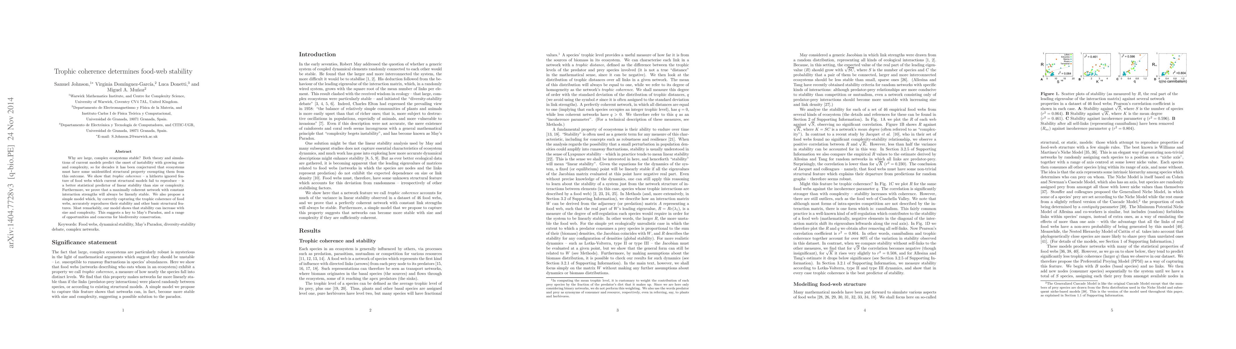 This paper demonstrates that "trophic coherence" in food webs, rather than size or complexity, is a superior predictor of ecosystem stability. The authors propose a new model that accurately reproduces stability and structural features by capturing this coherence, revealing that stability can actually increase with ecosystem size and complexity.