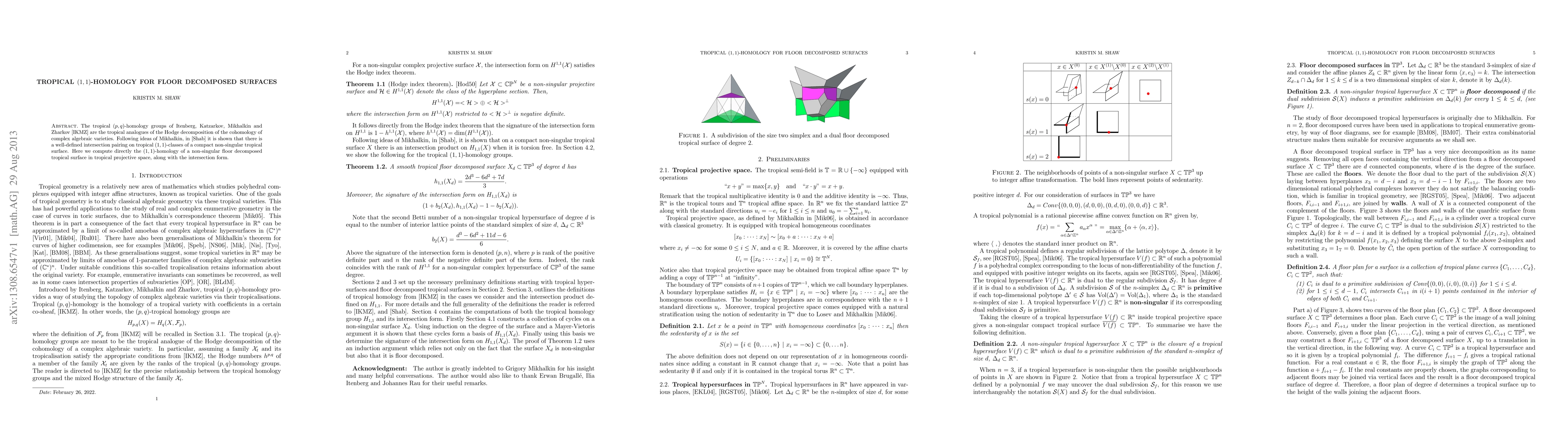 This paper computes the tropical (1, 1)-homology for non-singular floor decomposed tropical surfaces in tropical projective space, providing an intersection pairing on (1, 1)-classes as part of the tropical analogue to the Hodge decomposition in complex algebraic geometry.