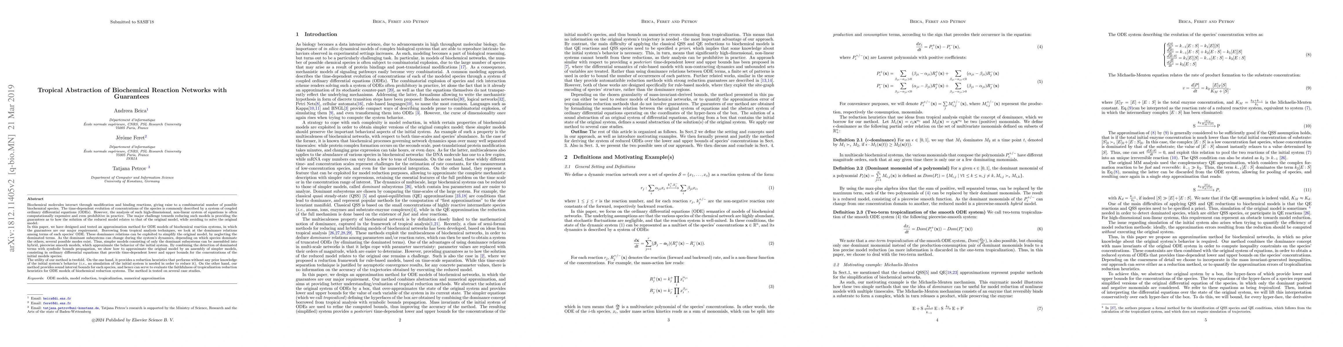 Biochemical molecules interact through modification and binding reactions, giving raise to a combinatorial number of possible biochemical species. The time-dependent evolution of concentrations of the species is commonly described by a system of coupled ordinary differential equations (ODEs). However, the analysis of such high-dimensional, non-linear system of equations is often computationally expensive and even prohibitive in practice. The major challenge towards reducing such models is providing the guarantees as to how the solution of the reduced model relates to that of the original model, while avoiding to solve the original model. In this paper, we have designed and tested an approximation method for ODE models of biochemical reaction systems, in which the guarantees are our major requirement. Borrowing from tropical analysis techniques, dominance relations among terms of each species' ODE are exploited to simplify the original model, by neglecting the dominated terms. As the dominant subsystems can change during the system's dynamics, depending on which species dominate the others, several possible modes exist. Thus, simpler models consisting of only the dominant subsystems can be assembled into hybrid, piecewise smooth models, which approximate the behavior of the initial system. By combining the detection of dominated terms with symbolic bounds propagation, we show how to approximate the original model by an assembly of simpler models, consisting in ordinary differential equations that provide time-dependent lower and upper bounds for the concentrations of the initial models species. Our method provides sound interval bounds for the concentrations of the chemical species, and hence can serve to evaluate the faithfulness of tropicalization-based reduction heuristics for ODE models of biochemical reduction systems. The method is tested on several case studies.