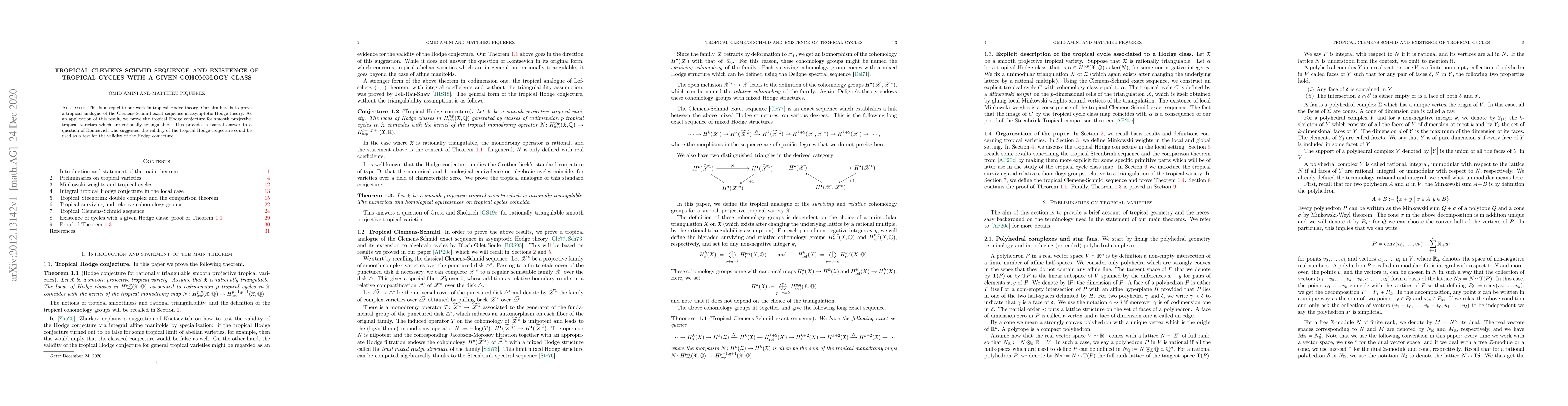 Summary: This paper establishes a tropical analogue of the Clemens-Schmid exact sequence in asymptotic Hodge theory and applies it to prove the tropical Hodge conjecture for rationally triangulable smooth projective tropical varieties, partially addressing Kontsevich's suggestion.